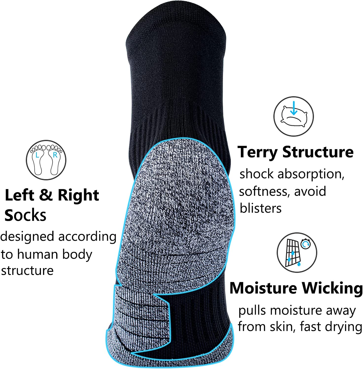 UNIQUE SOLE: Moisture wicking fibers pull moisture away from skin; Cushioned, more soft and comfy, shock absorption; Design LEFT AND RIGHT SOCKS according to the plantar structure