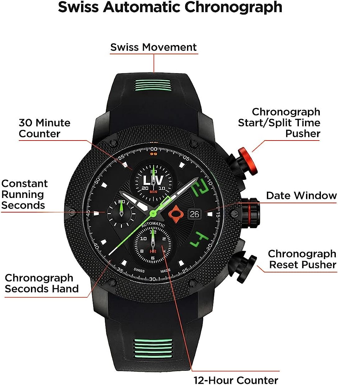 LIV GX-AC Swiss Automatic ETA 7750 26 Jewel Movement Chronograph 46mm 316L Case, 3D Multi-Layer Dial + Quickset Date - Rugged Classic Watch for Men - Skeleton Case-back - Sapphire Crystal - 330 FT Wat