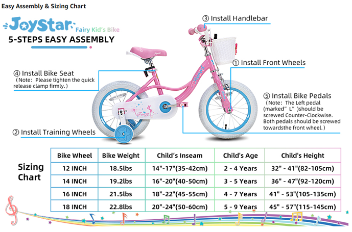 - Best Gift for Kids - This JOYSTAR Fairy girl's bike with 12-inch wheels is designed for children 2-4 years old or 33-41inches tall. The Fairy is perfect for riding to the park or riding on the sidewalk around the neighborhood.