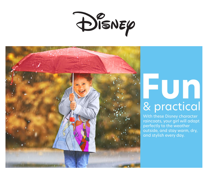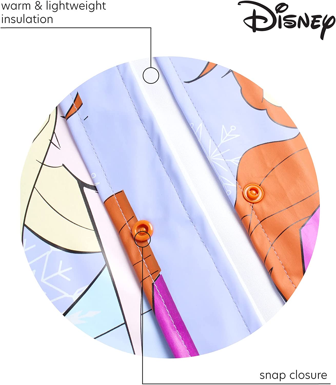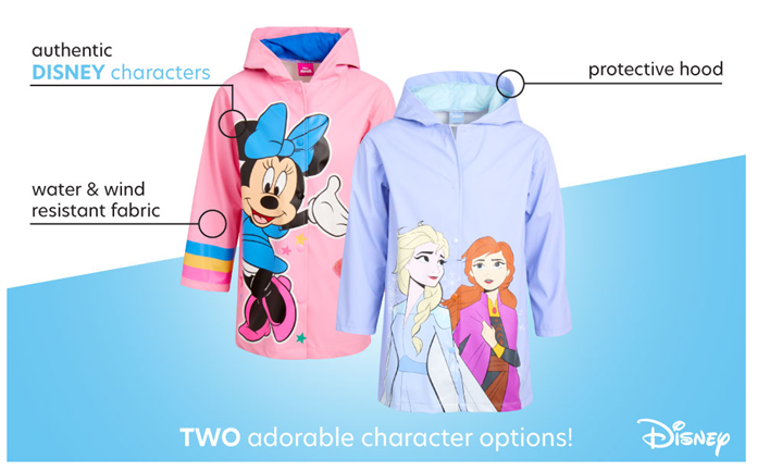 GIRLS' DISNEY RAINCOAT: This multipurpose and versatile Disney raincoat is a must-have for your baby girl that will help her stay safe from the elements when the weather changes suddenly; Perfect jacket for all little fans of the Disney cartoons and characters, featuring a big and vibrant Minnie Mouse print or Frozen princesses, Elsa and Anna