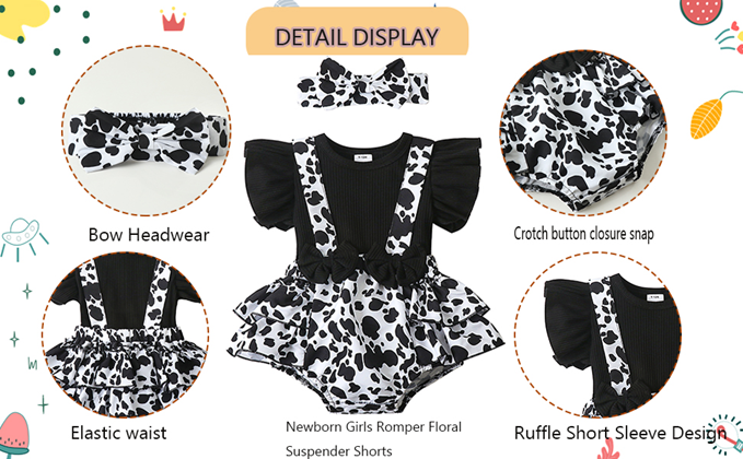 [Unique Cute Design] The newborn baby girl clothes set is 2 pieces, Cute bowknot, Plain solid black ruffle sleeve shorts romper, Floral overalls Suspender design with a Unique matching Headband. The newborn outfits for girls create a more appealing impression. Convenient Snap closure for easy diaper changes.