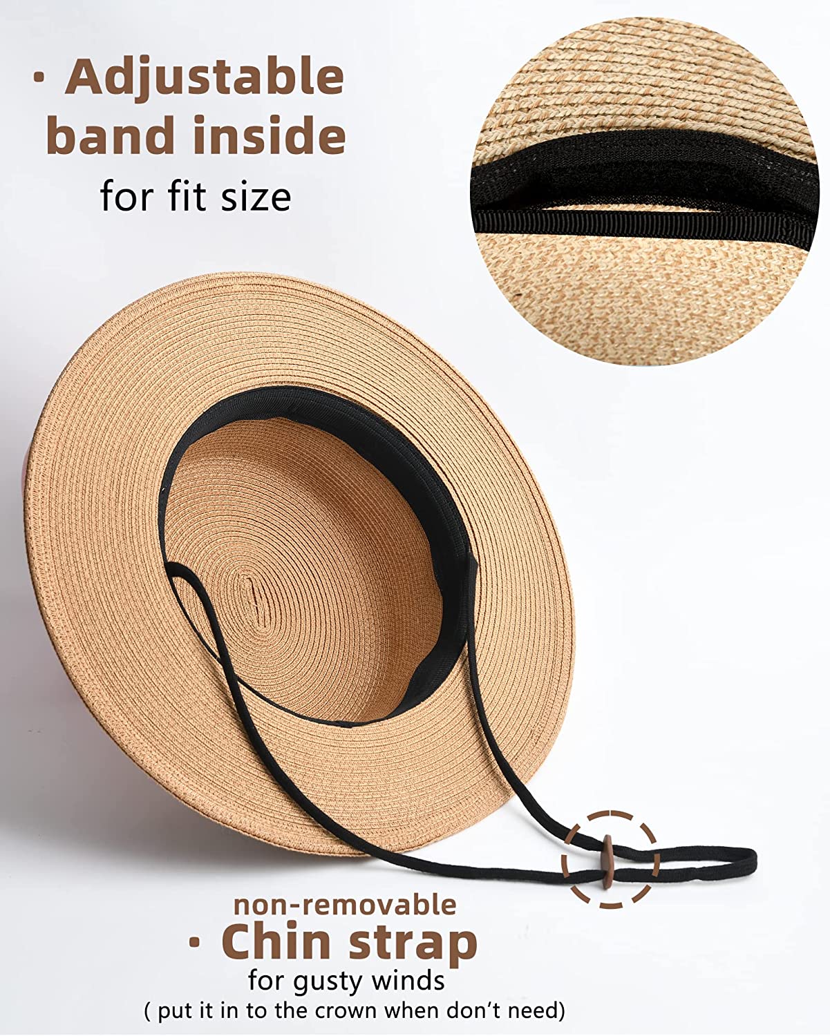 Two Sizes to Fit Most: Two sizes are offered for this beach hats; Size M is recommended for head circumference around 22"-23 1/8" and Size L is recommended for head circumference around L 23 1/8"-24" ; If you feel it is too tight or too loose, you can adjust the size by inner velcro; Also, a detachable chin strap can hold it in place in blustery days,that you can keep the hat stable on top of your head.And Inner sweat band to help wick away moisture during the hot & humid summer seasons;