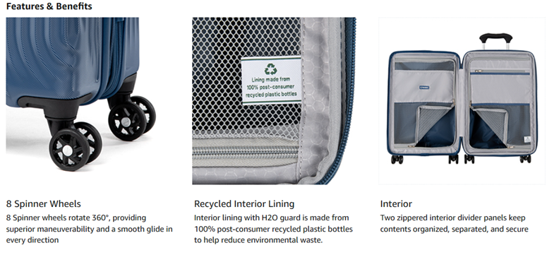 • Sizer bin tested to fit in the overhead bins of most major domestic airlines while allowing for more packing capacity. 8 Spinner wheels rotate 360, providing superior maneuverability and a smooth glide in every direction
