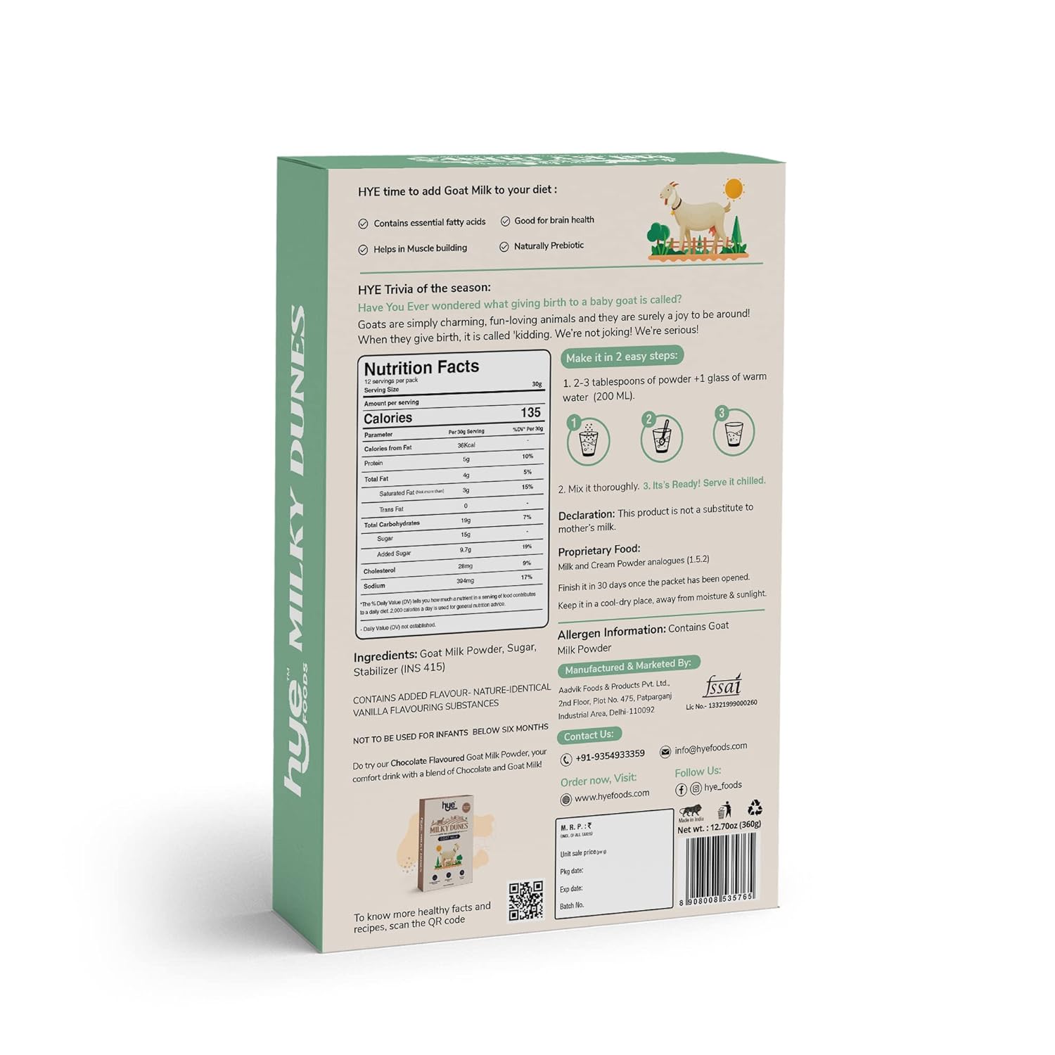 Hye Foods’ Milky Dunes Vanilla Goat Milk Powder is Lab-Tested and Manufactured in FDA, BRC, FSSAI, HACCP, and ISO-Certified plants.