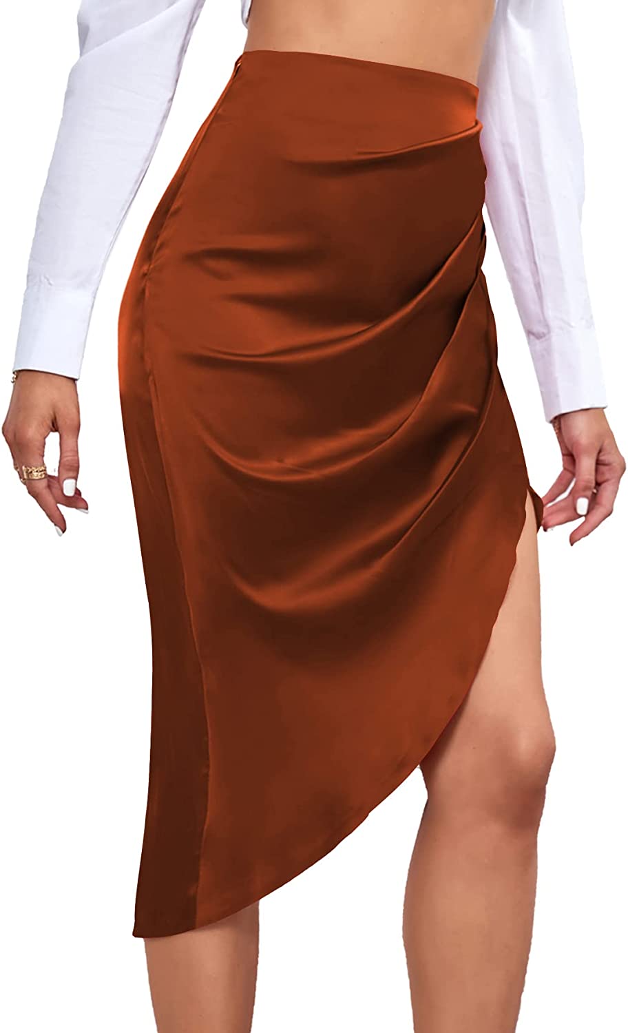 Solid color, high split side, ruched, satin skily frabric, high waist cocktail midi skirt for women and girls.