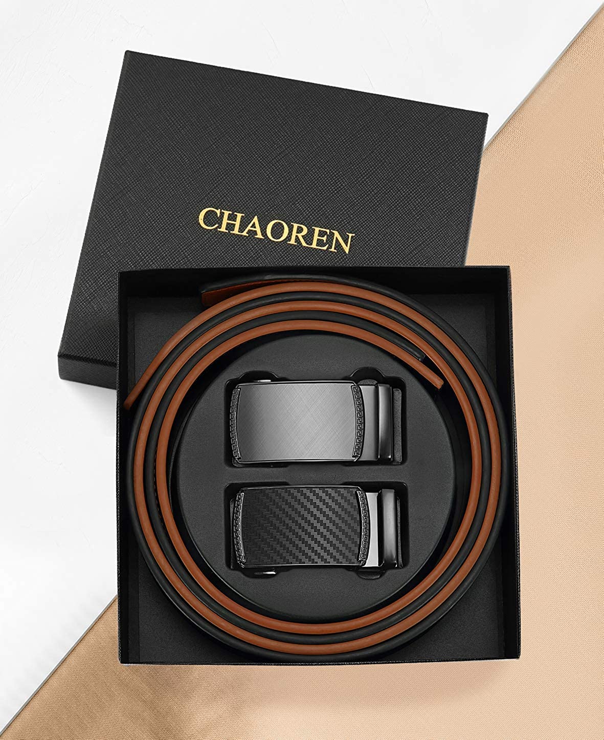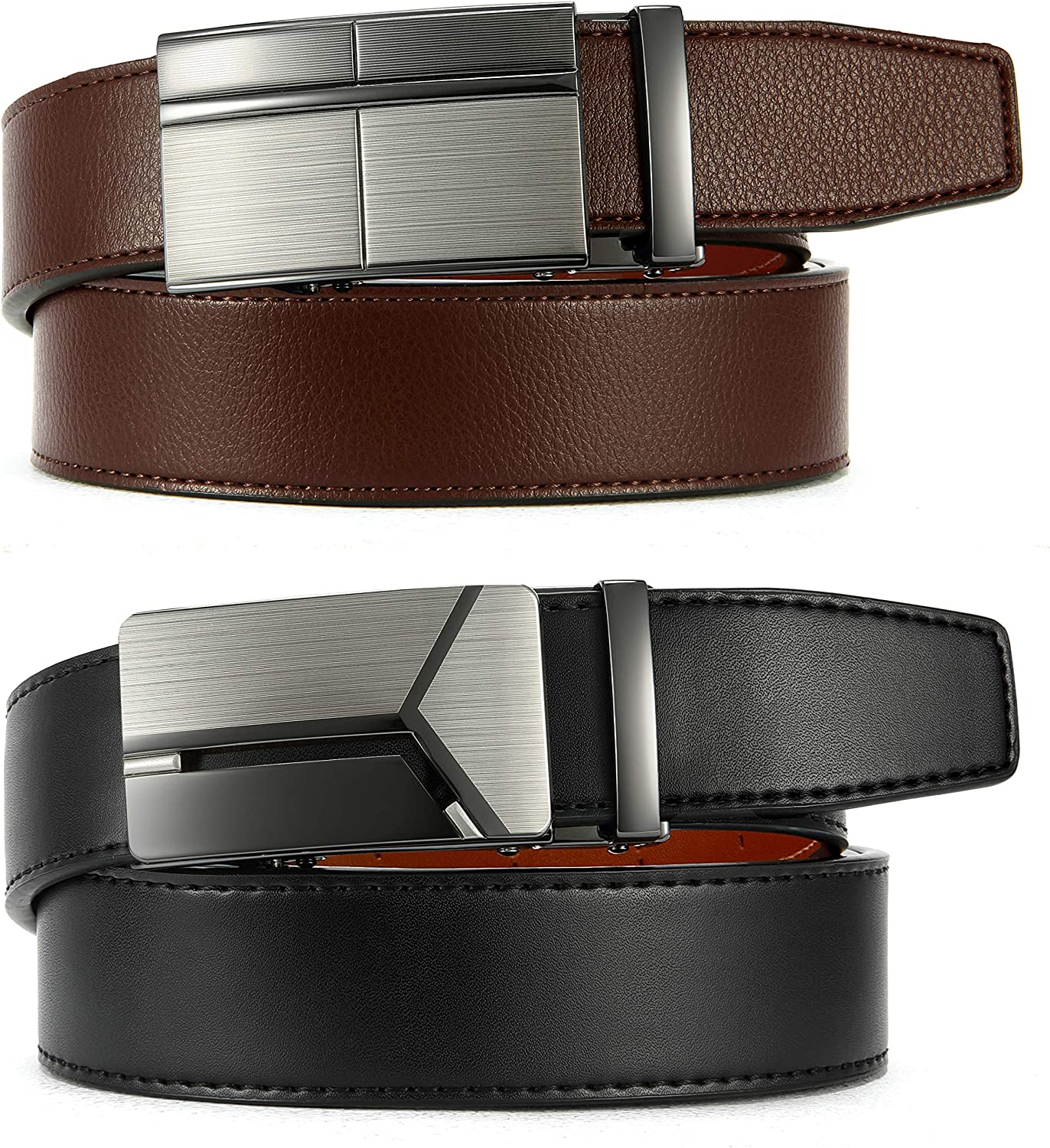 EASY TO USE - Slide the black and cognac belt into the buckle, and click on the buckle to lock it automatically. Gently push the lever on the side of the automatic buckle, and pull the casual jeans belt to release. Simple, smooth, and sleek!