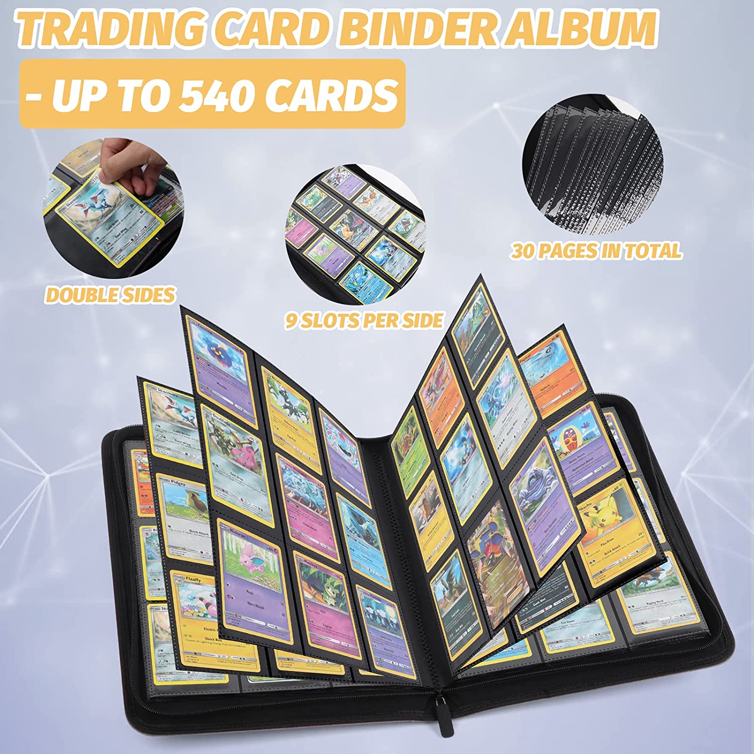 • 【Large Card Storage Capacity】9 pocket per page premium quality zip-u trading card binder.30 pages, It means that it can hold 540 cards,providing plenty of space to get all your cards organized.