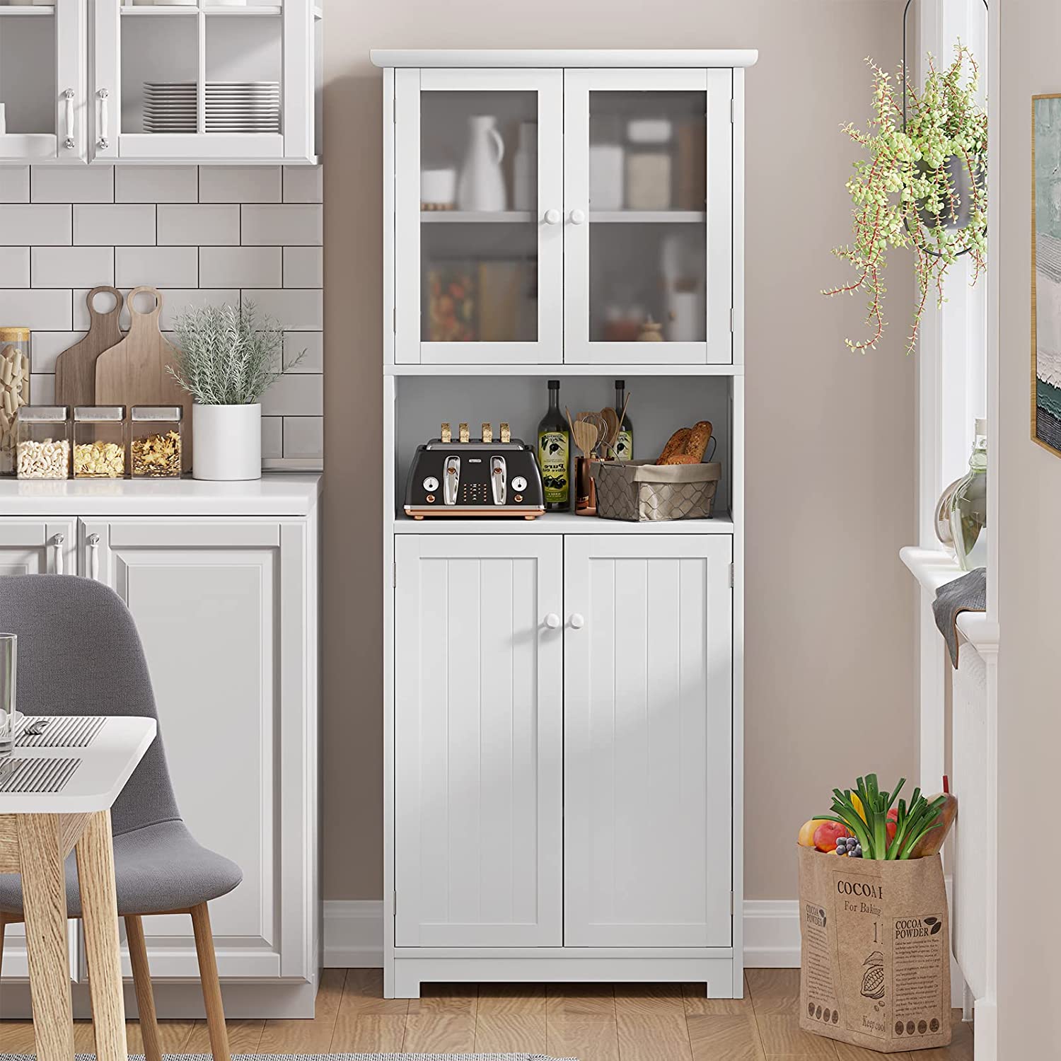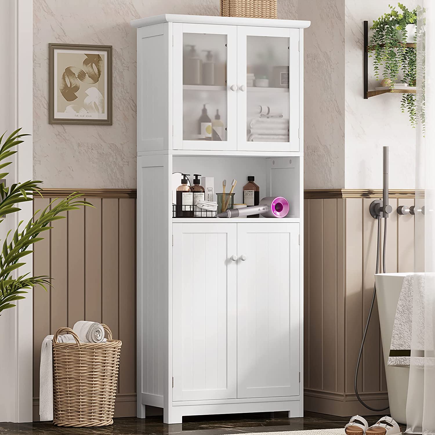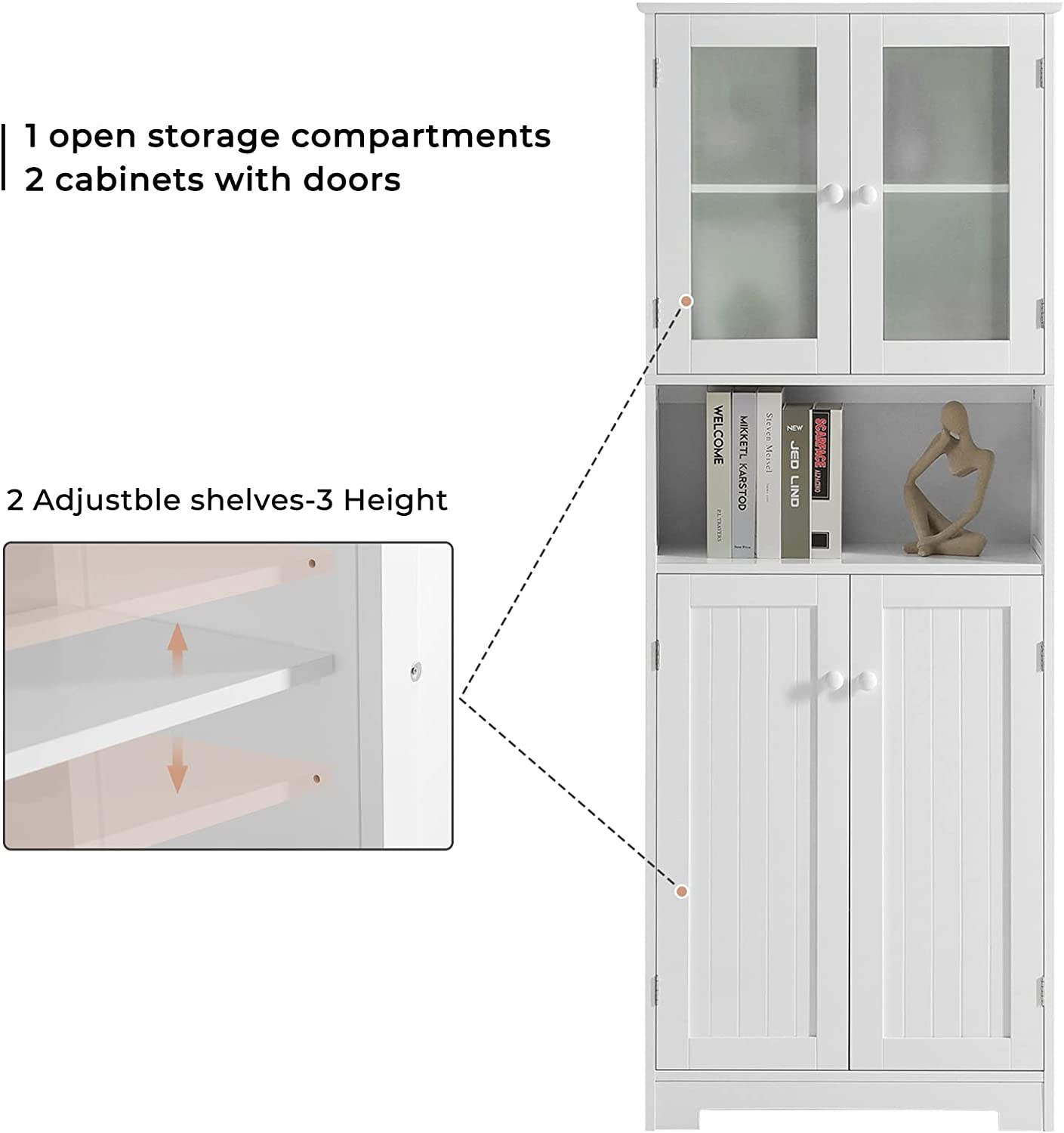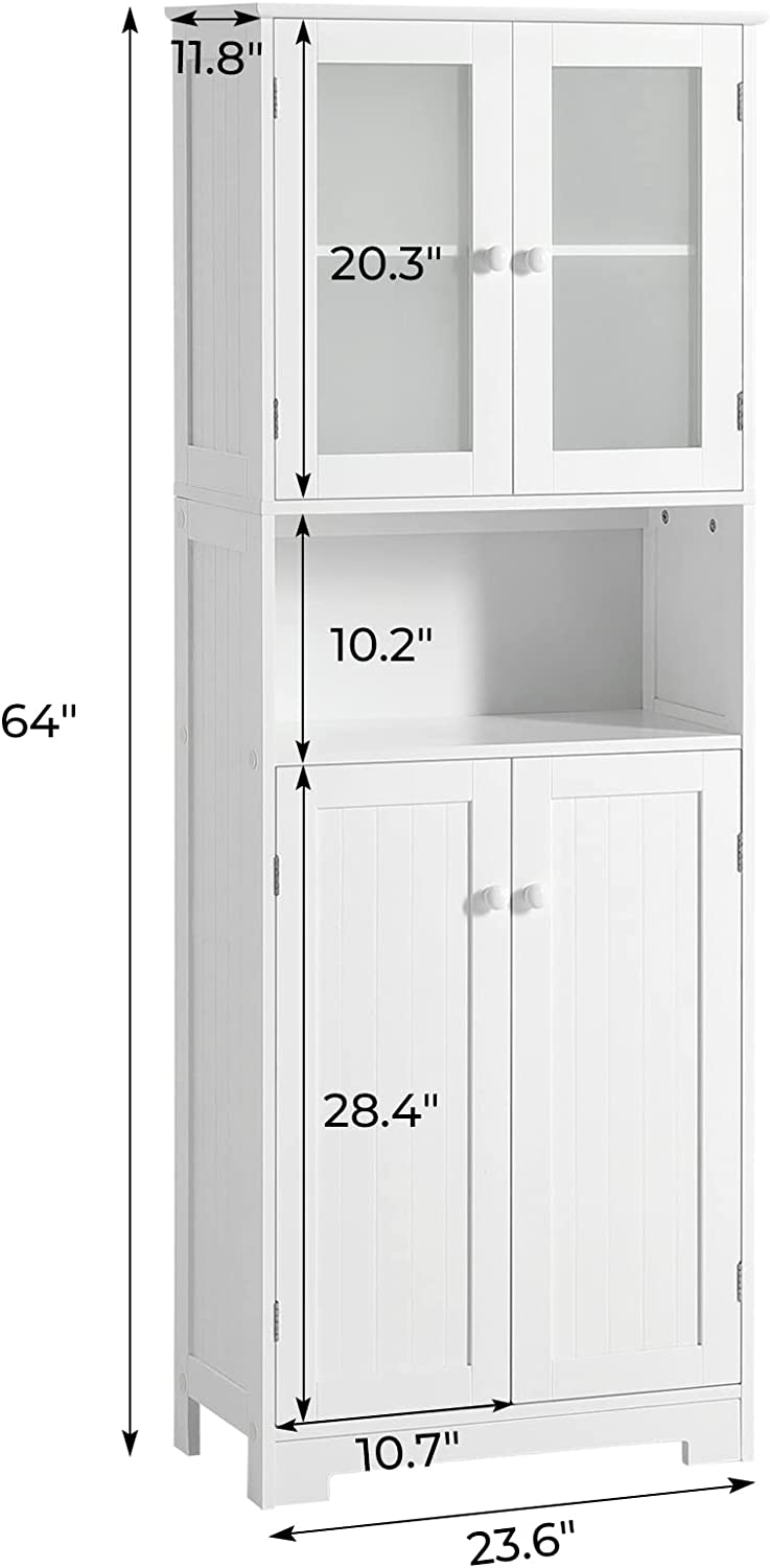 【CRAFTED & STURDY CONSTRUCTION】This tall bathroom floor cabinet is made of high-quality P2 MDF and white paint, the glass door is made of tempered safety glass. High-quality materials are waterproof and moisture-proof. This freestanding cabinet is built upon 4 raised feet, which keeps the cabinet from water immersion, and easy to clean the floor.