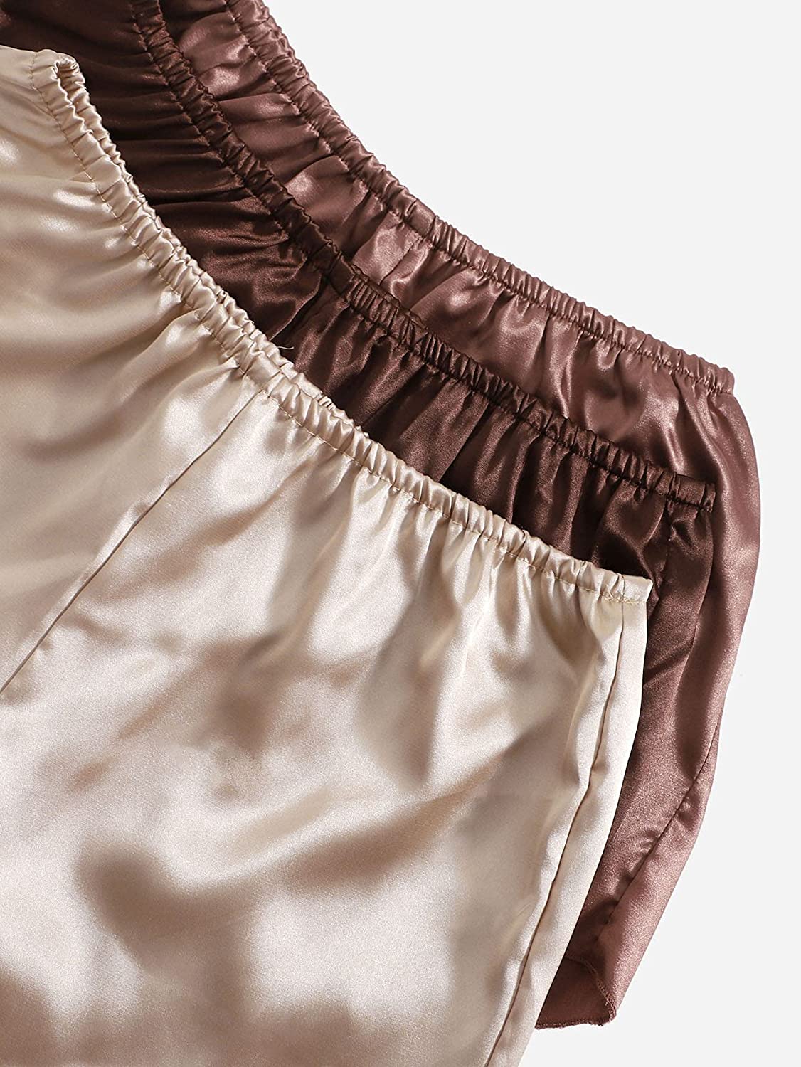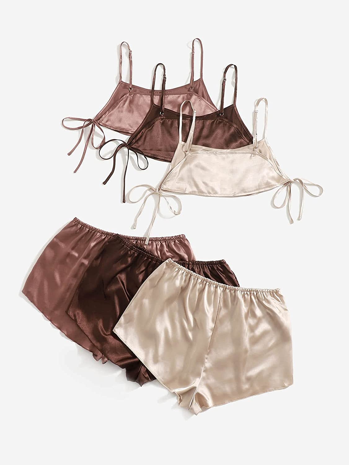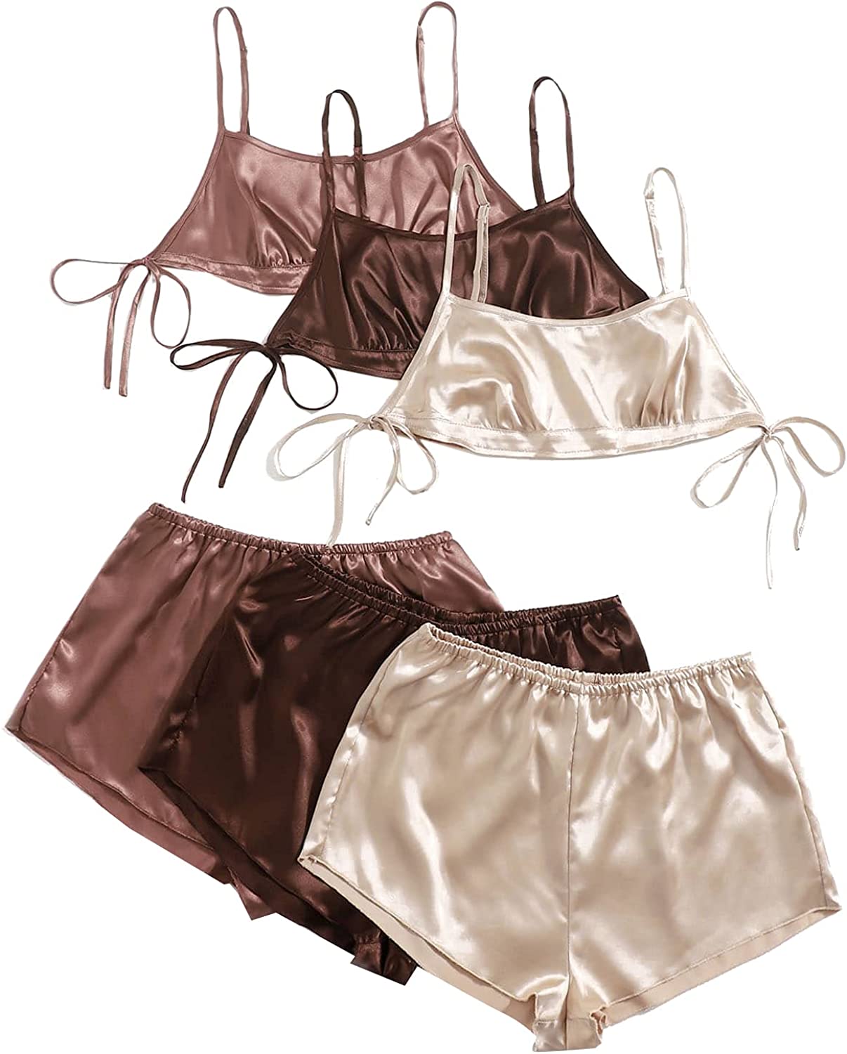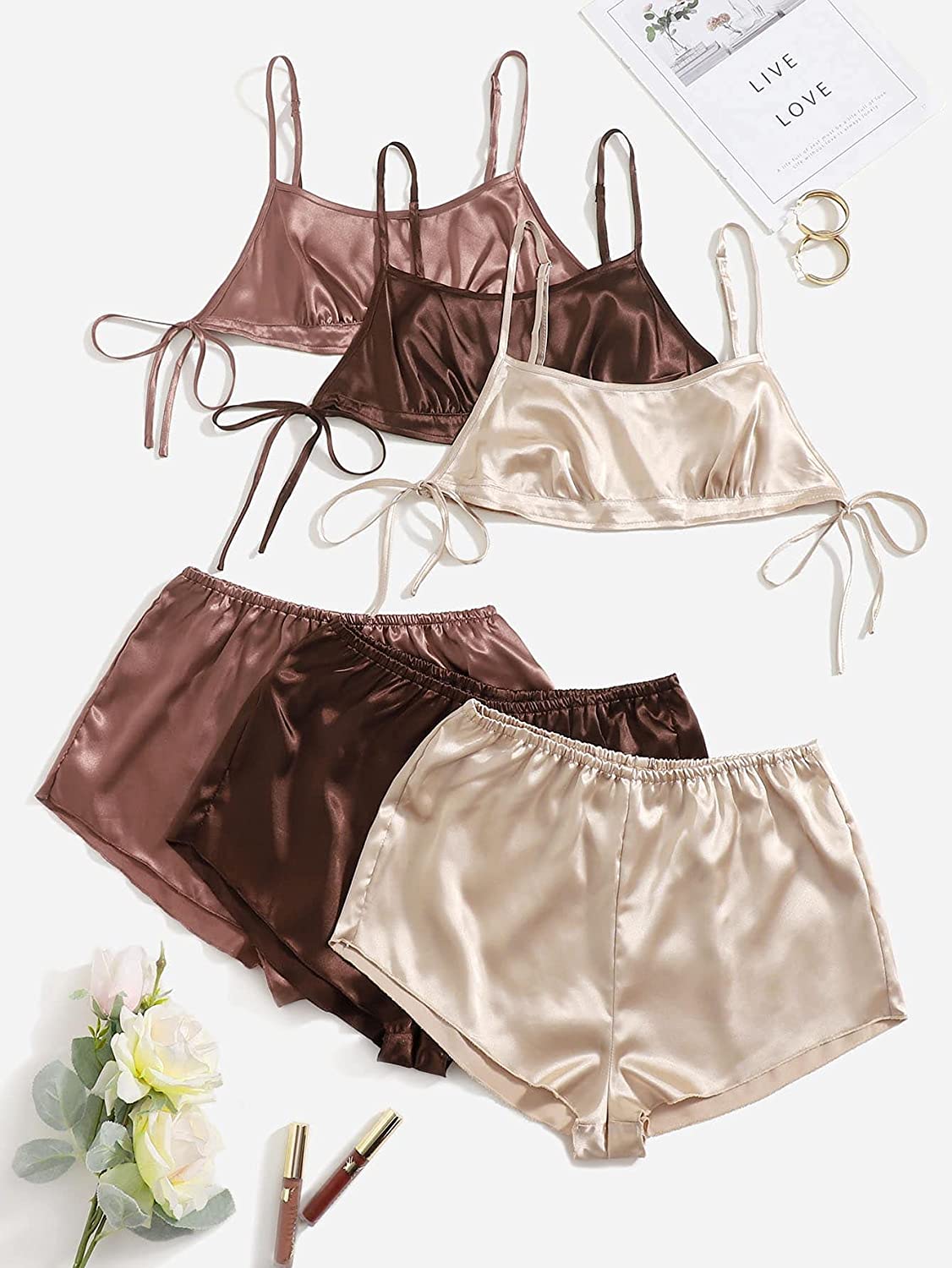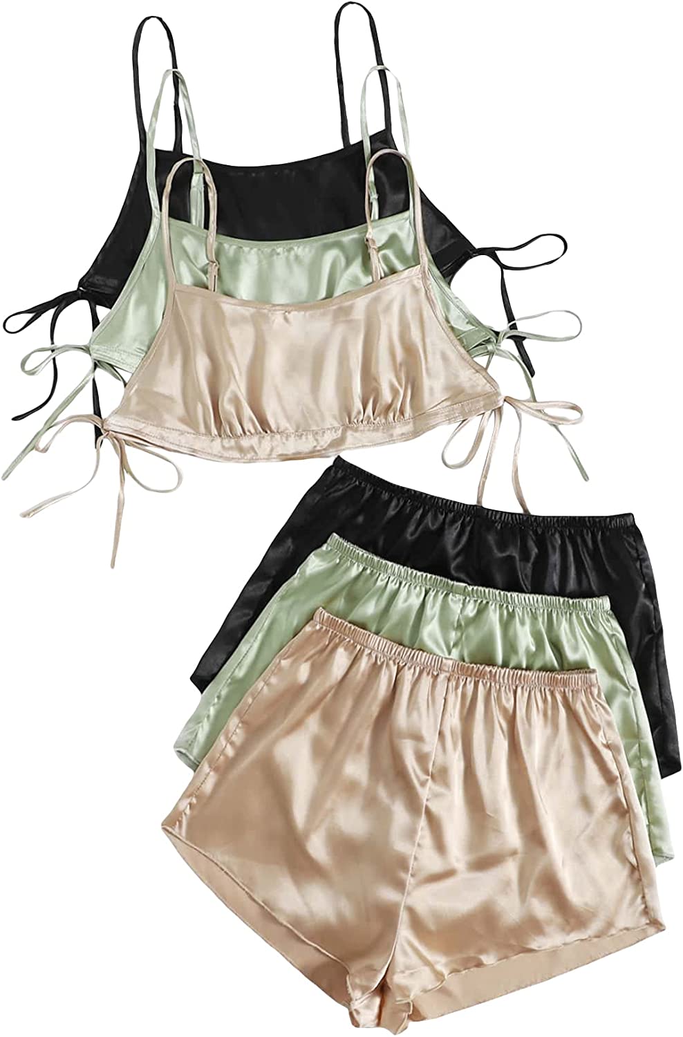SheIn Women's 3 Sets Tie Side Satin Lounge Set Sleeveless Crop Cami and Elastic Waist Shorts Sleepwear Pajama Set