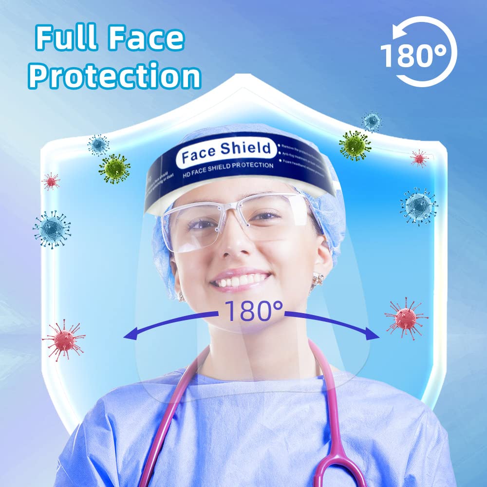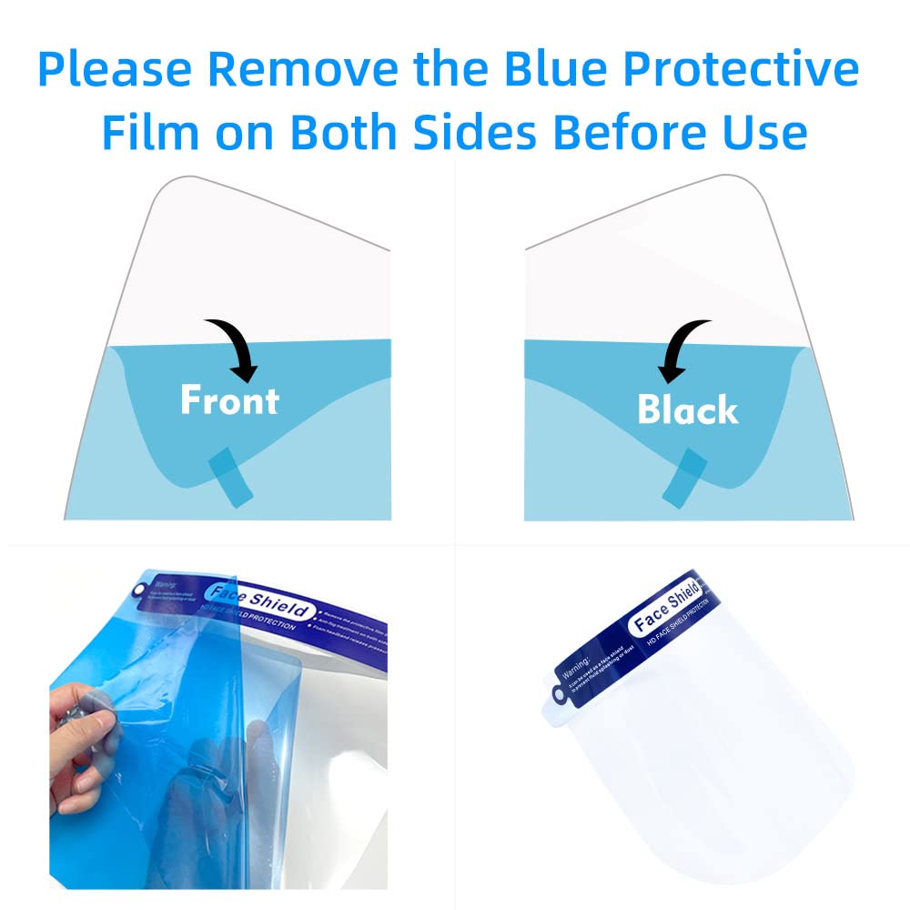Full Clear Face Shield:Safety face shield for work is coated with anti-fog material,not fog up your glasses when you breathe.double-sided anti-fog effect. The plastic face shield mask covered with the protective films both side, befor use kindly remove them you can see clearly.