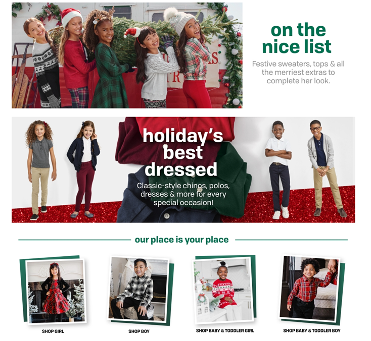 - THE CHILDREN'S PLACE — We offer a huge selection of kid's clothing! Shop us for jeans, shorts, leggings, chinos, polo shirts, dresses, pajamas, and accessories.