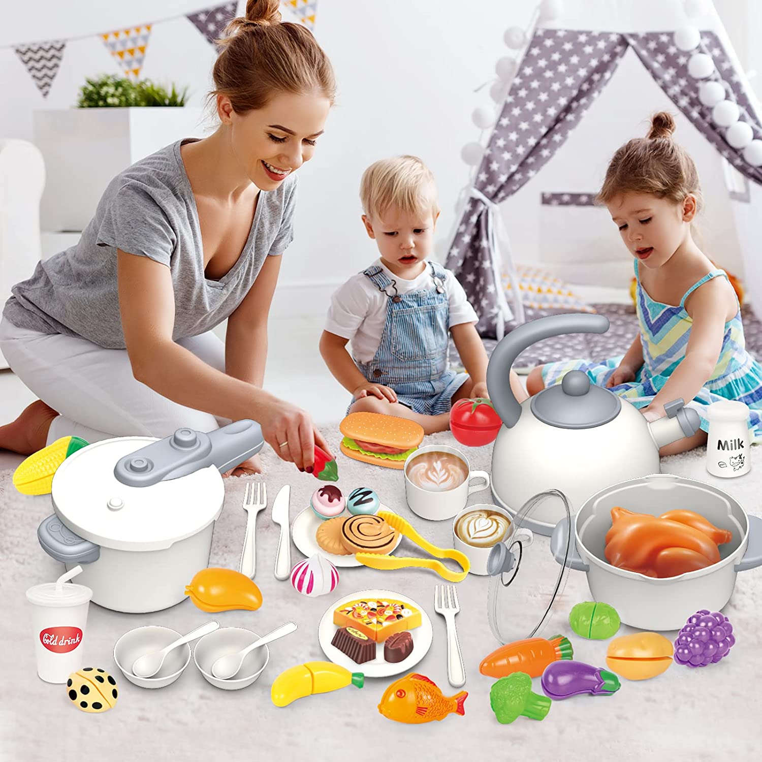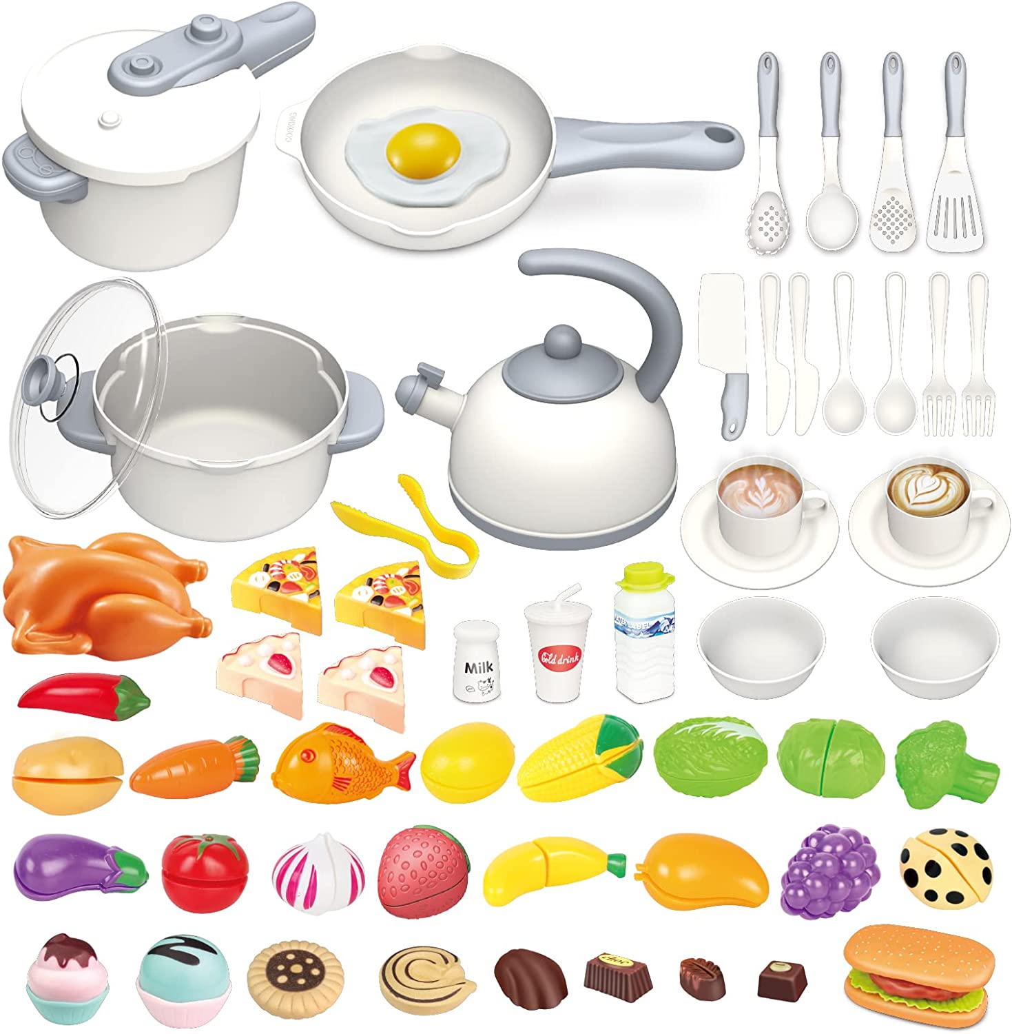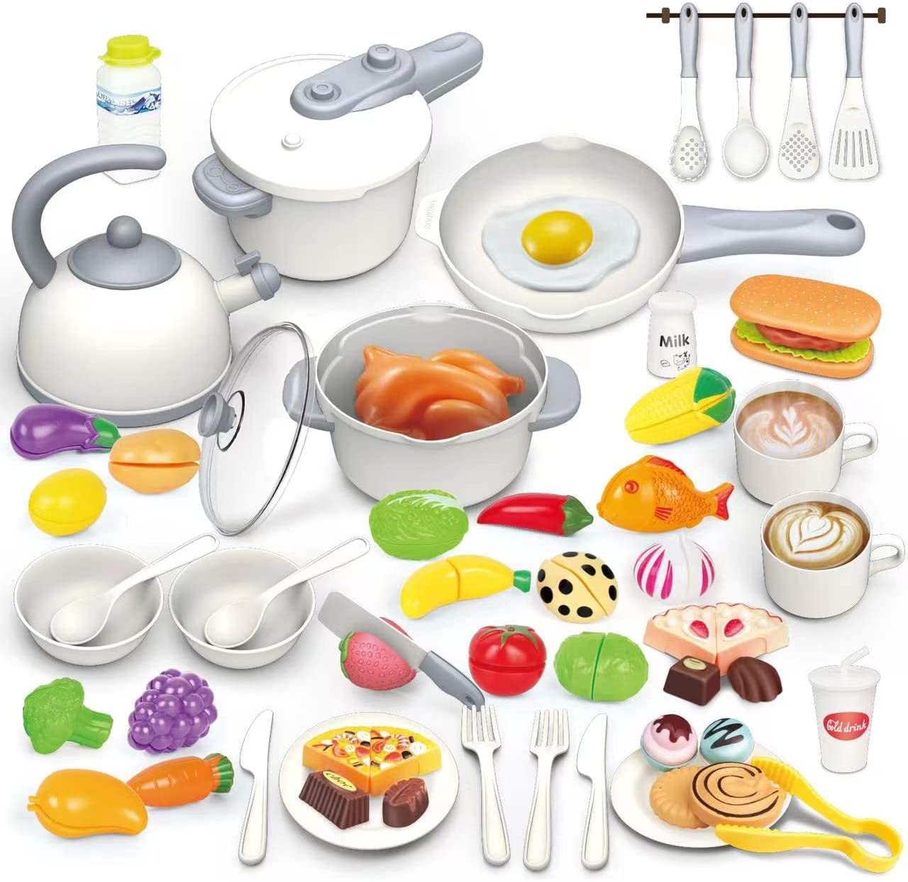【76 PCS Play Kitchen Toys Set】Total 76 pieces all in this kitchen play set, more accessories than other similar set! Includes a pan, a pot, a pressure cooker, a kettle.Moreover, these kitchen toys also come with play kitchen food with different vegetables, fruits, fast foods, seafood, and dessert .