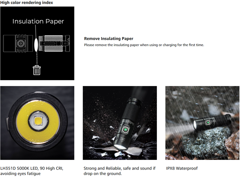 - Tough & Reliable: with USB cover, IPX8 waterproof SC21 flashlight survives under water (not for diving). Clip it on your cap, enjoying fishing or boating. No need to worry about dropping it in water.