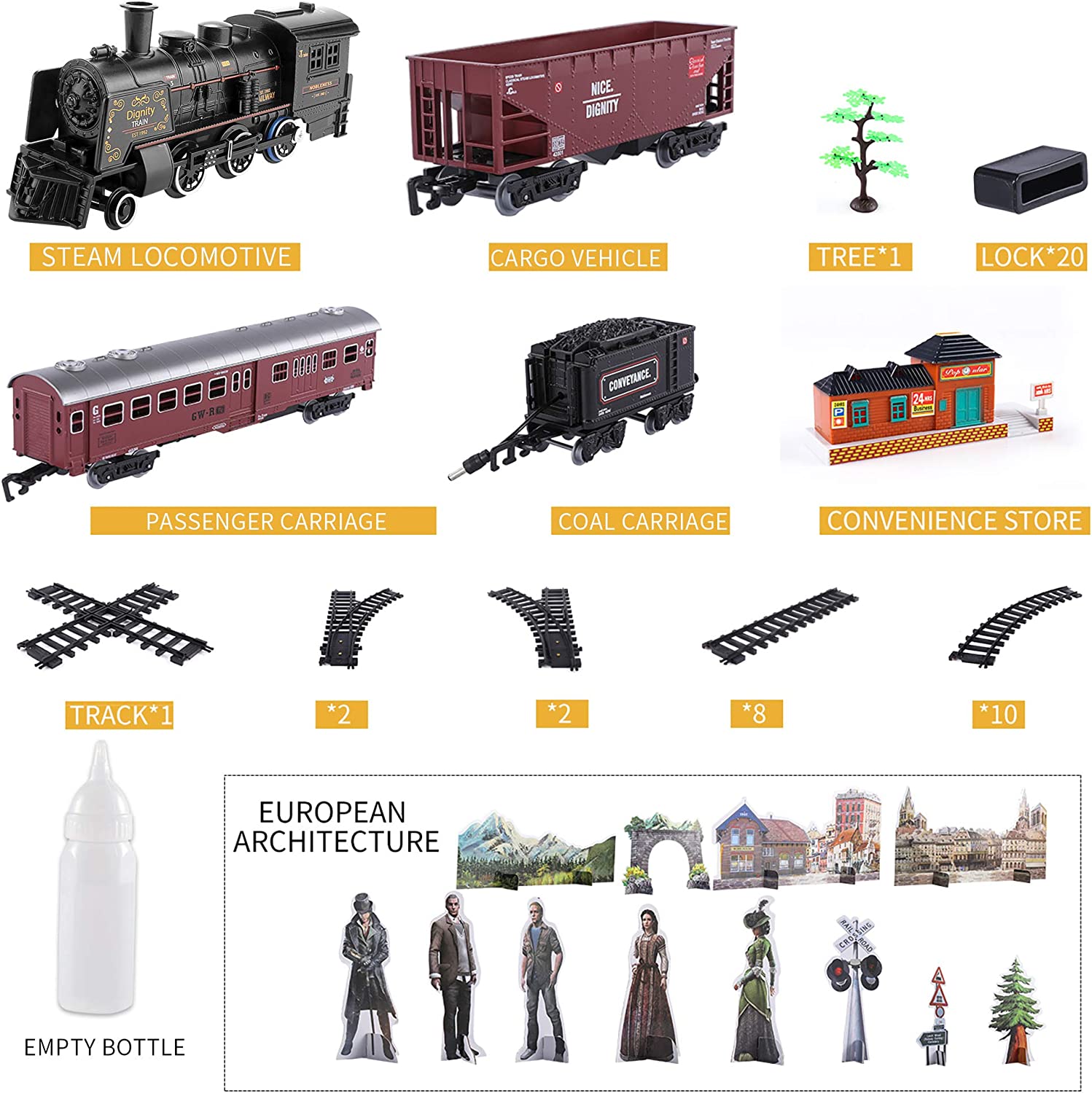 - Includes: locomotive steam engine, a passenger coach , a cargo vehicle, a coal car,tracks ,Traffic signs,European architecture and figures.Dimension: 71.2’’ (L) x 30.7’’ (W) long oval layout of track ,+ inner loop expansion