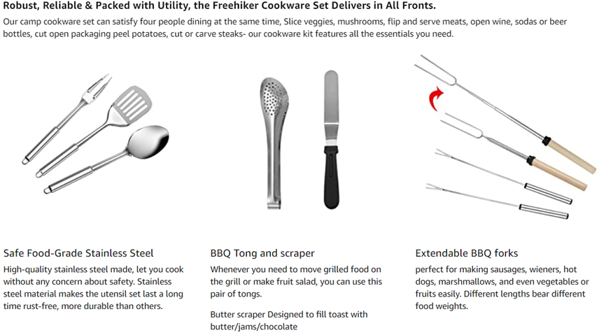 - ✅ Freehiker brings you the ultimate outdoor utensil set, It is a complete and professional BBQ grill kit that will satisfy all your needs for cooking, perfect for travel, picnics, RVs, camping, hiking, backyard BBQ-ing, parties, concerts, sporting events, boat rides, mountaineering and more. BAG SPECS: 14.5” length, 9” width, 3” thick.