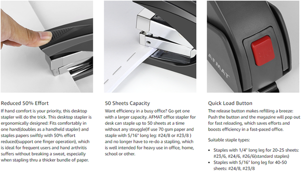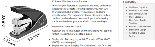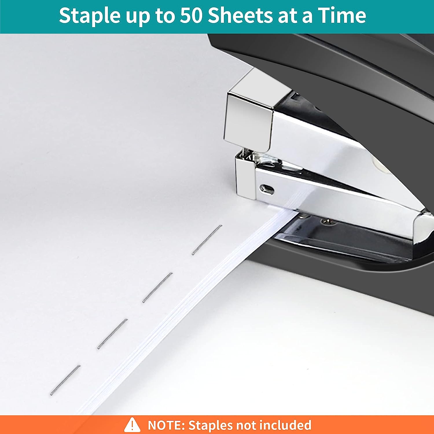 • 【50-SHEET Stapling Capacity】Want efficiency in a busy office? Go get one with a larger capacity. AFMAT office stapler for desk can staple up to 50 sheets at a time without any struggle(If use 70 gsm paper and staple with 5/16" long leg: #24/8 or #23/8 ) and no longer have to re-do a stapling, which is well intended for heavy use in office, home, school or other. (Tips: While stapling, please be sure to press it down way deep enough before releasing)