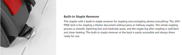 • 【JAM-FREE Stapler for Desk】This stapler with a built-in staple remover for stapling and unstapling almost everything. The JAM-FREE tech is for stapling a thicker document without jams or halfway staples. The whole stapling process is smooth, lightning fast and relatively quiet, and the staple leg after stapling is well bent and clean looking. The built-in staple remover at the back is easily accessible and always there ready for use.
