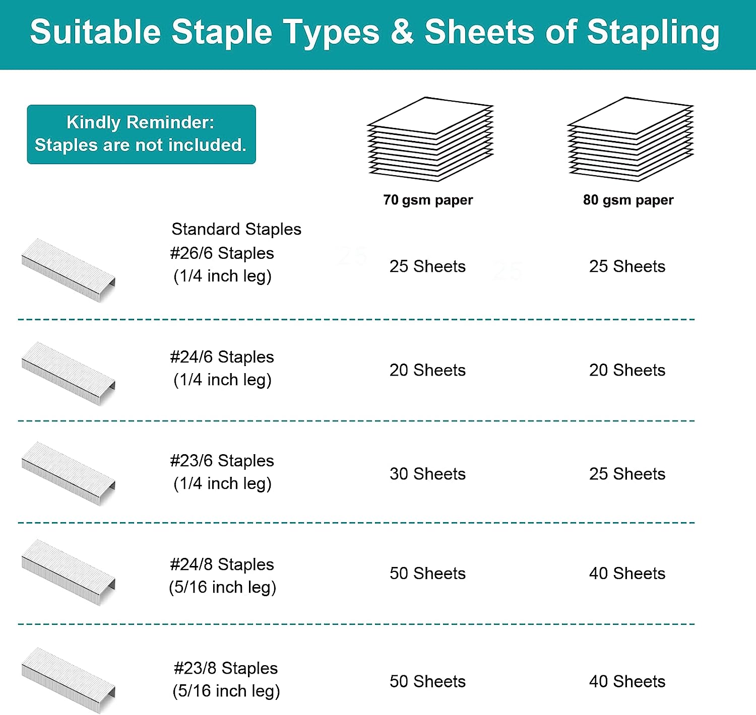 • 【Easy to Use & Quick Reloading】Easy to use as a one finger touch stapling stapler on the desktop or a handheld stapler on the go! The release button makes refilling a breeze: Push the button and the magazine will pop out for fast reloading, which saves efforts and boosts efficiency in a fast-paced office. Suitable staple types: staples with 1/4" long leg for 20-25 sheets: #23/6, #24/6, #26/6(standard staples) and staples with 5/16" long leg for 40-50 sheets: #24/8, #23/8 (Staples not included)