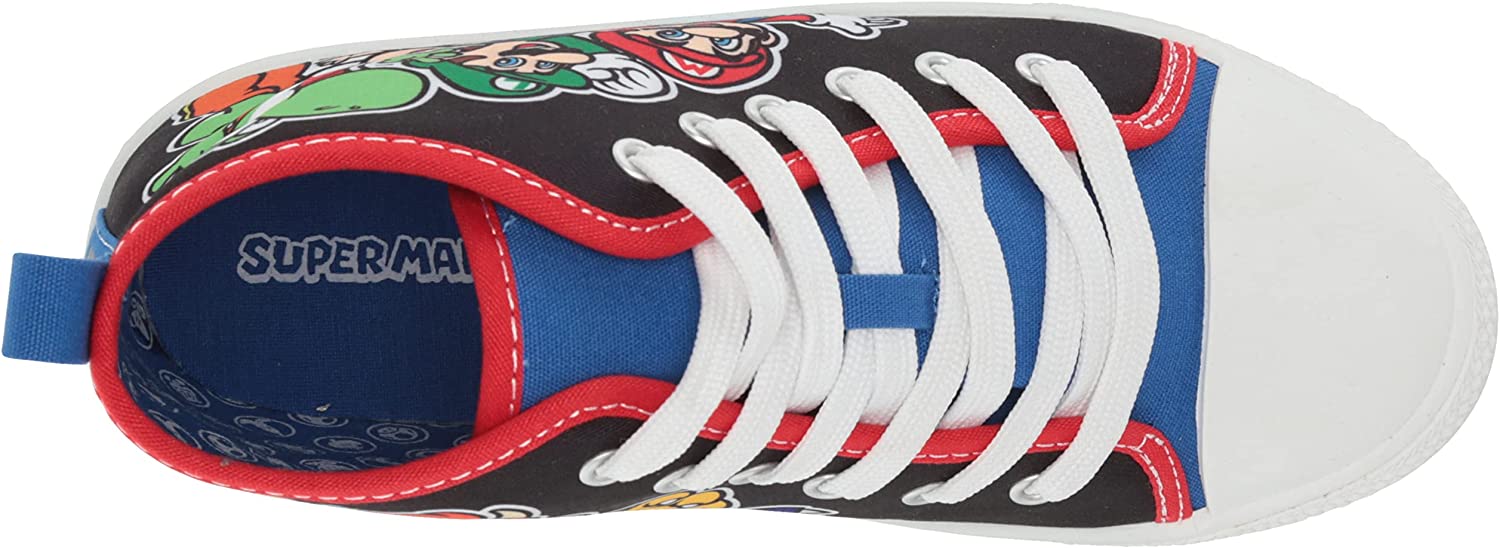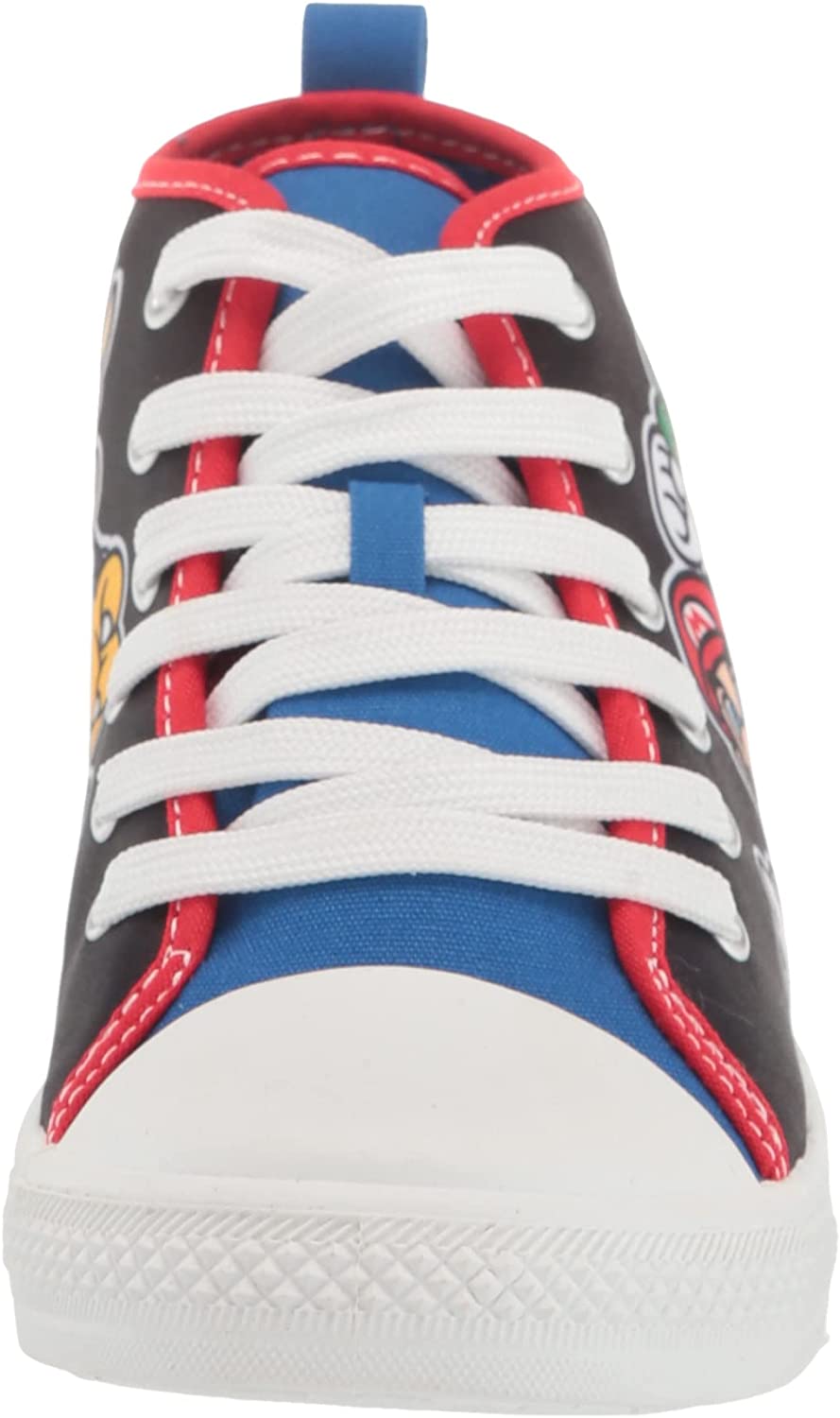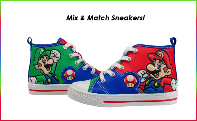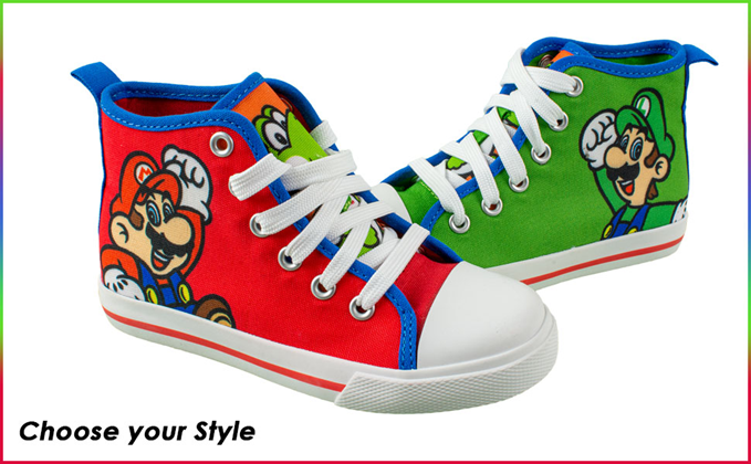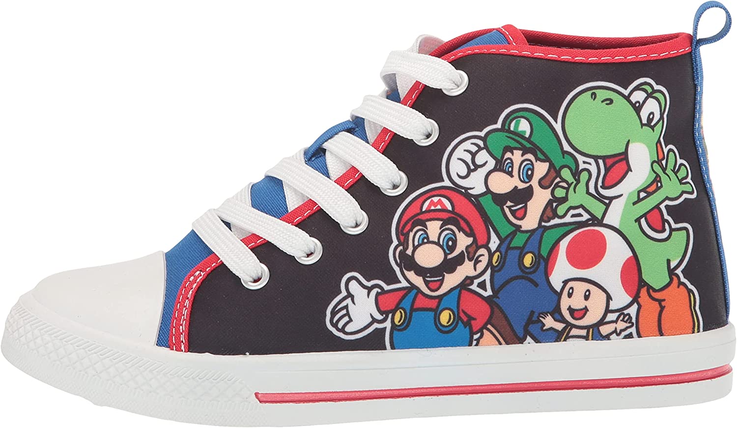 Nintendo Super Mario Brothers Mario & Luigi are back! Enjoy the warmth and comfort of these Hi top skate sneakers, indoors and out! Perfect for any Nintendo, Super Mario, and Mario Bros fan! Shoes have a lightweight canvas upper for premium comfort and flexibility. Mario on one side, and Luigi on the other; bright vibrant Red and Green is the classic, fun, and perfect look for any Nintendo fan! Perfect skate tennis shoe for any weather- especiually in spring and summer for the outdoors. Sizes range from Toddler size 7, to Kids size 3, perfect for ages 4 to 10 - for every Mario, Luigi and Nintendo fan! **Please note, size 7, 8 and 9 come with Red and Green laces, size 10, 11, 12,13,1,2, and 3 come with white laces