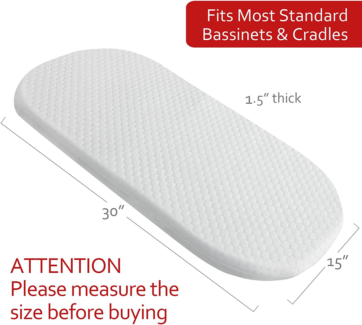 Perfect Fit: The mattress measures 15" x 30" x 1.5", specifically designed to fit oval shaped bassinets. Please measure the inside of your bassinet to ensure a perfect fit. These baby bassinet mattress are made in our manufactory which are certified OEKO-TEX Standard 100.