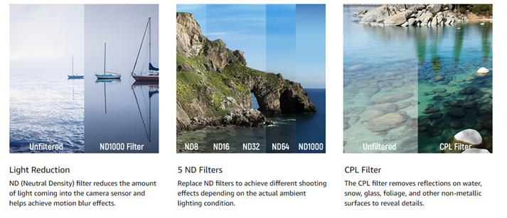- 【Reduce Lens Flare】Neutral density filters reduce light to decrease the chance of overexposure. Polarizer filter increases contrast while eliminating reflection and glare. The CPL Filter is at a preset level and can prevent unnecessary glare from reflecting surfaces (such as water, snow and even glass windows) without rotation.