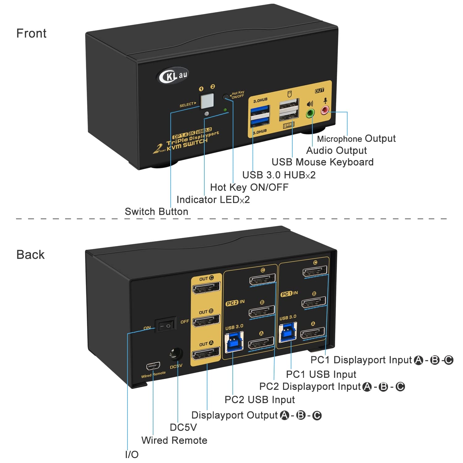 1. 2 Port KVM Switch Displayport 144Hz: 2 computers/laptops sharing one set of keyboard & mouse, 3 monitors, audio, microphone and 2 pcs USB 3.0 peripheral devices. It comes with audio and microphone output, 2 pcs USB 3.0 hub, a DC5V 2A power adapter, and all input cables. (Tips: 1. This KVM switch required each of your computers with 3 video outputs, otherwise, 3 monitors can't display together. 2. This KVM switch without simulation EDID function, windows maybe move after switching.)