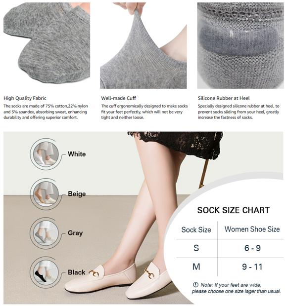 【No Show】No show and low cut invisible design goes well with most shoes such as sneakers,loafers and casual shoes. (NOTE: This sock is not suitable for a super low flat shoe) The short no see socks are available in four basic colors: black, white, nude and light gray, and 6-9/9-11 2 size ranges providing you more choices.