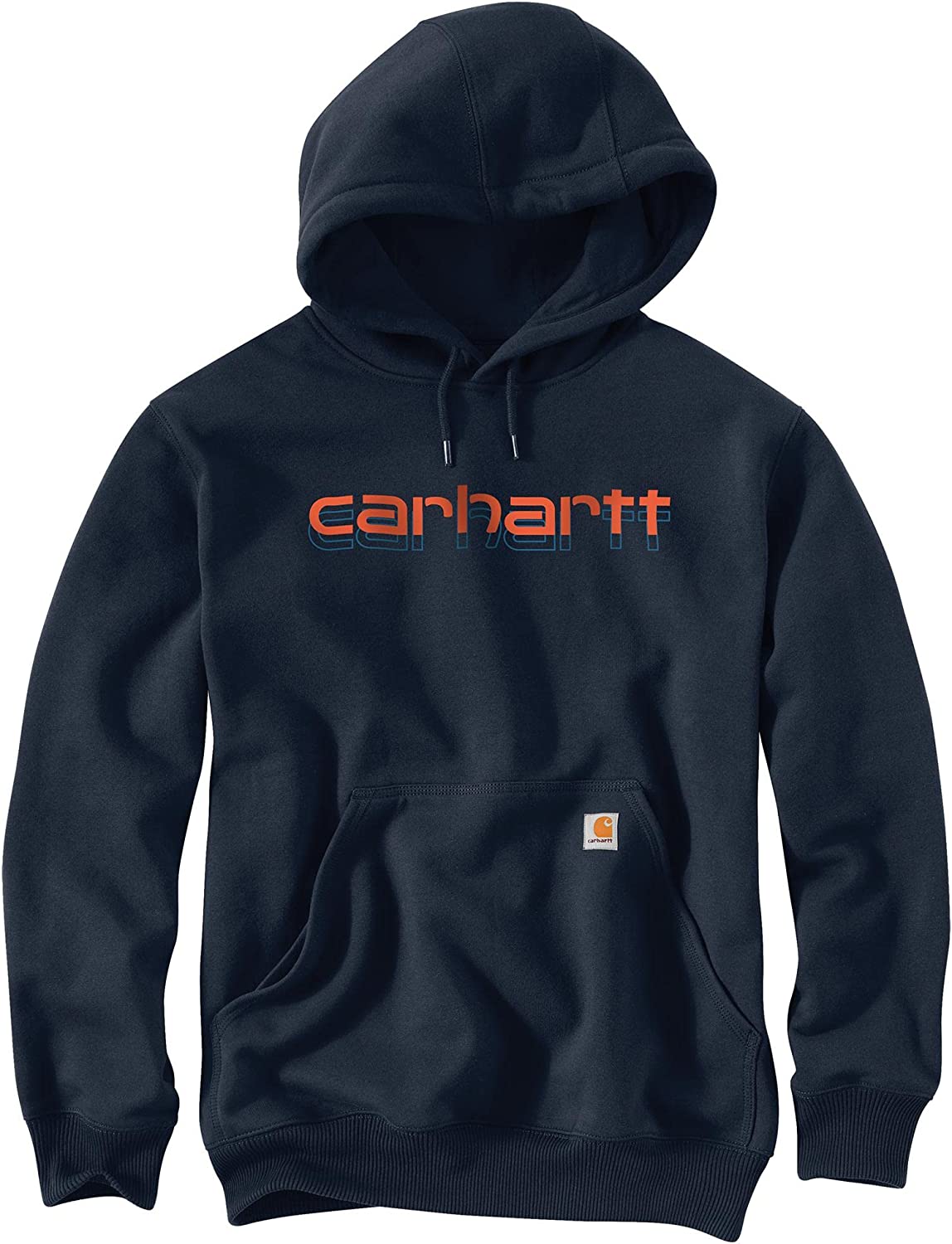 Work through light rain in this men's Carhartt hooded sweatshirt. The midweight, cotton-blend fabric is treated with a water-repellent coating that sheds wet weather. The roomy loose fit makes it easy to throw on over another layer for extra warmth.