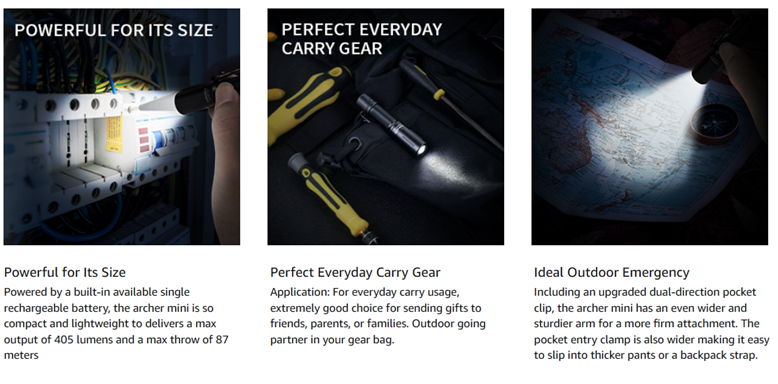 | Specific Uses | Camping, Hiking, Dog Walking, Hunting, Boating, Patrolling, Working, Runing, Power Outages, Emergency, Inspection, Repair |