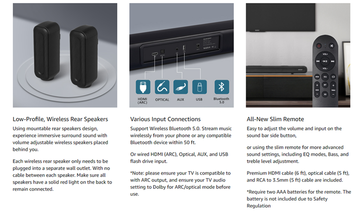 - ADVANCED CONNECTIVITY & CONTROL - Our 5.1 sound bar adopts Bluetooth 5.0 & DSP technology to ensure faster transmission speeds and stable connectivity up to 50 ft with low consumption from your Smartphones, Tablet, PC and other Bluetooth-enabled devices; You may also connect the sound bar to TV, Projector, Computer, XBOX, PS5, Amplifier, and more via HDMI ARC, RCA, or Optical input connection. All cables are included. You may control the sound bar using your TV remote in ARC input mode.