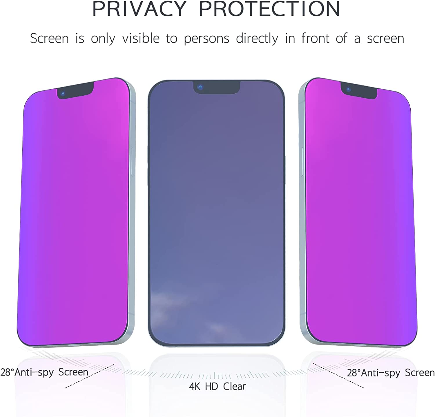 • 【28° Privacy Protection】Privacy screen protector for iPhone 13 Pro Max/iPhone 14 Plus, the screen only visible to people within 28°, people beside only see different shades of purple screen. Protect your privacy and sensitive information when in public.