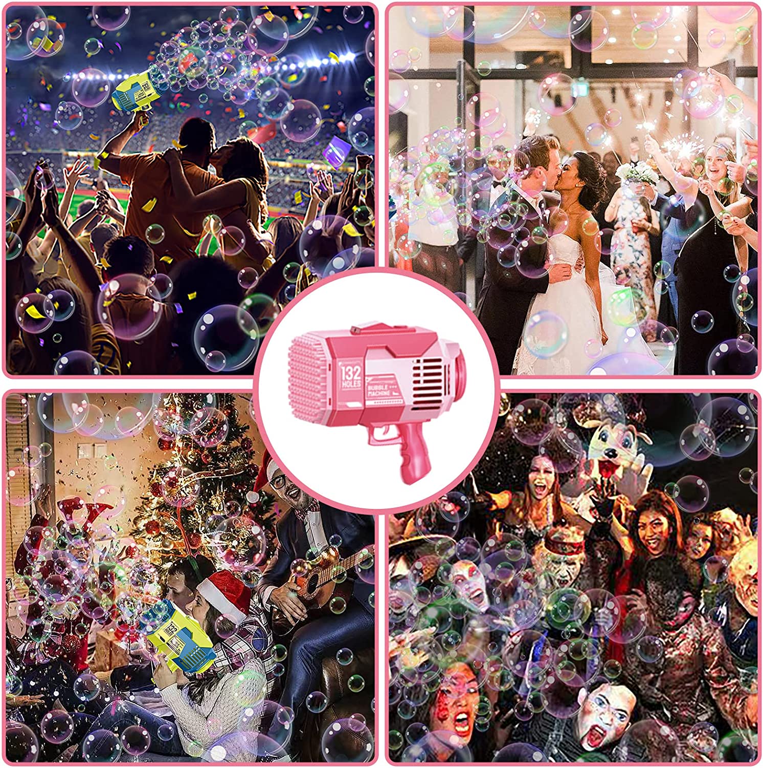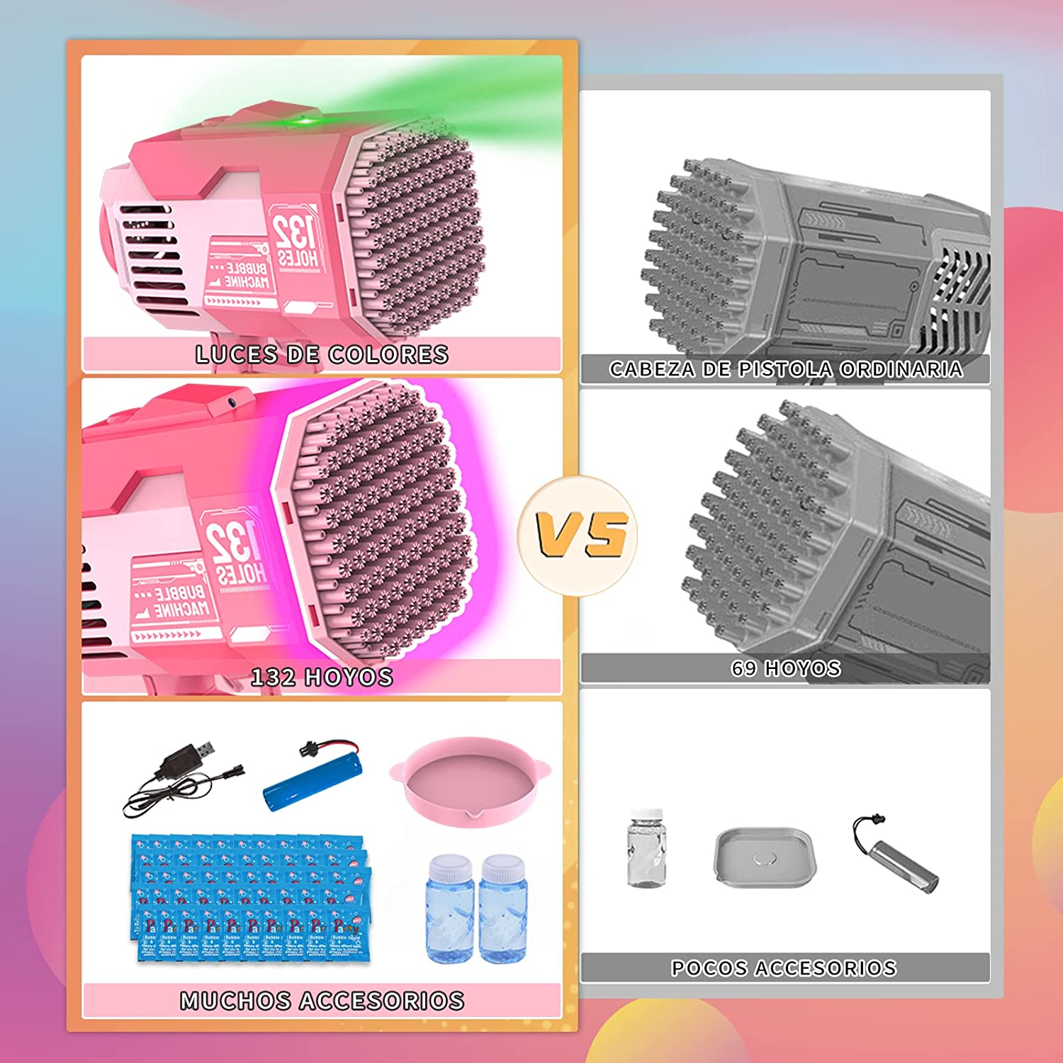 【Newly Upgraded 132-Hole Design】- The product includes a 132-hole Bubble Gun, two Bubble Liquid Bottles, 50 concentrated Bubble liquid packets, one sticker, one bubble tray, a rechargeable battery, and a charger. The tray is easy to clean and won't stick to your hands.