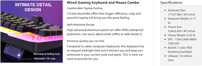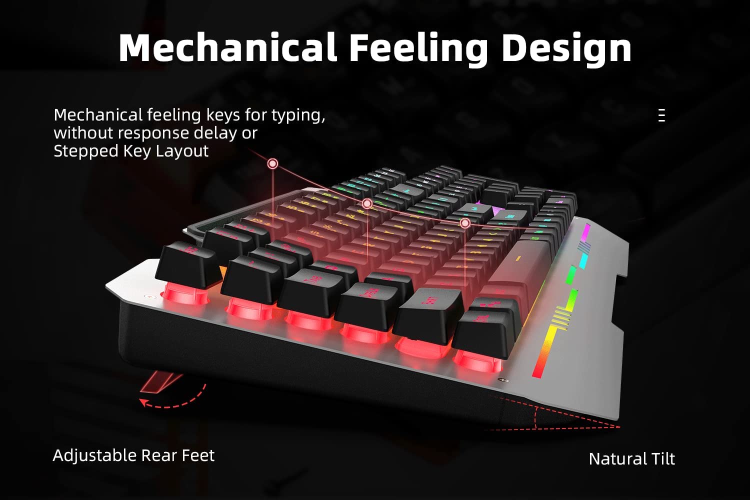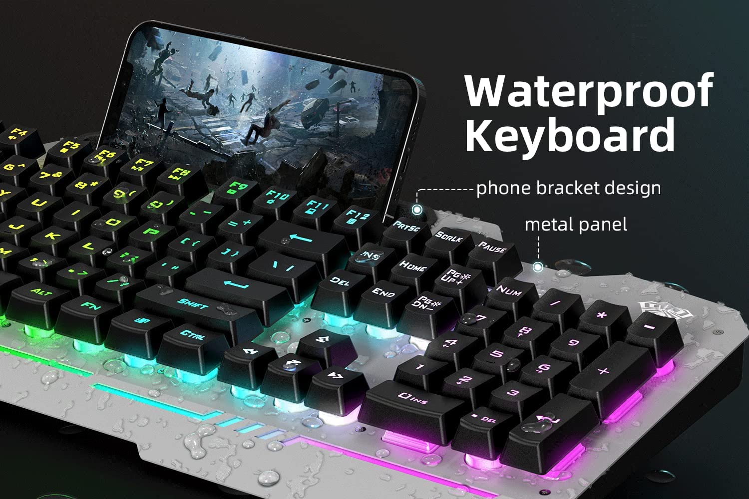 - COMFORTABLE TYPING FEELING: Made of an aluminum alloy brushed panel, this gaming keyboard and mouse combo is sturdy and durable. The ergonomic design of both the keyboard and mouse releases your hands from fatigue. 2.0mm keystroke offers fast trigger efficiency and rebound speed, which will bring you a fabulous typing feeling typing experience.