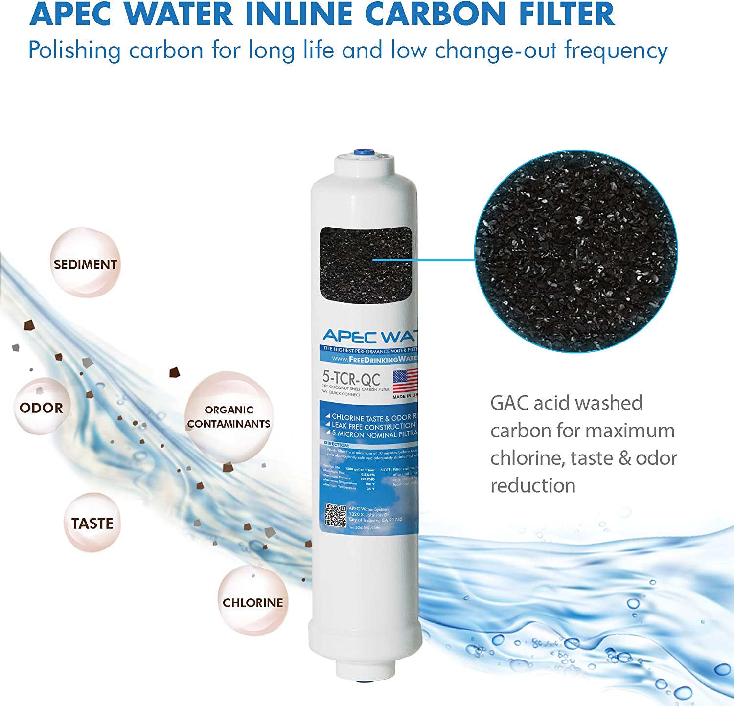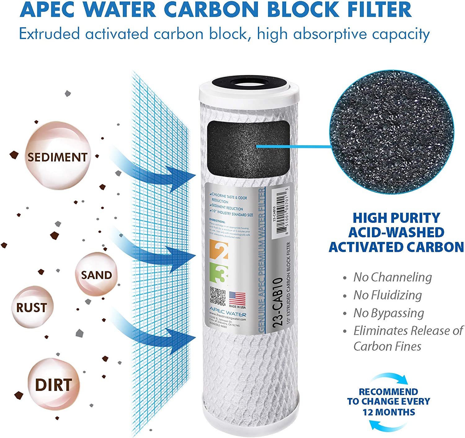 2nd and 3Rd stage: premium extruded carbon block 10 inch -gets rid of unpleasant chlorine, tastes, odors, cloudiness and colors. Also removes VOC and other common harmful agents from the water. Apec's extruded carbon block filters consist of activated carbon particles fused into a uniform block with enhanced adsorptive capacity and efficiency. Unlike granular activated carbon (GAC) filters, these extruded carbon block cartridges will not channel or bypass due to the extreme uniformity of their extruded activated carbon core.