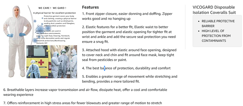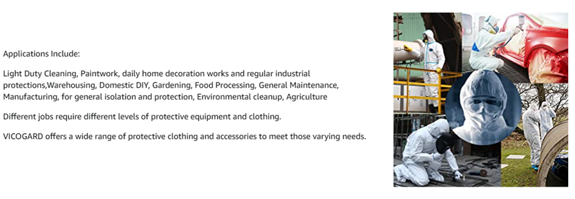 VVicogard COV003 garments are composed of flash spun high density polyethylene which creates a unique nonwoven material, We provide an ideal balance of protection, durability and comfort , It offers a physical barrier to dry particles such as dried paints,    sanding dust, powders and fiberglass, offers excellent protection. From the Manufacturer
