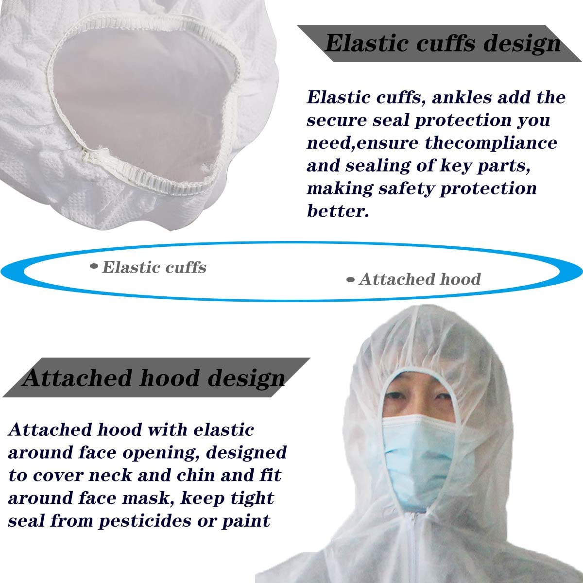 3. Attached hood with elastic around face opening, designed to cover neck and chin and fit around face mask, keep tight seal from pesticides or paint.