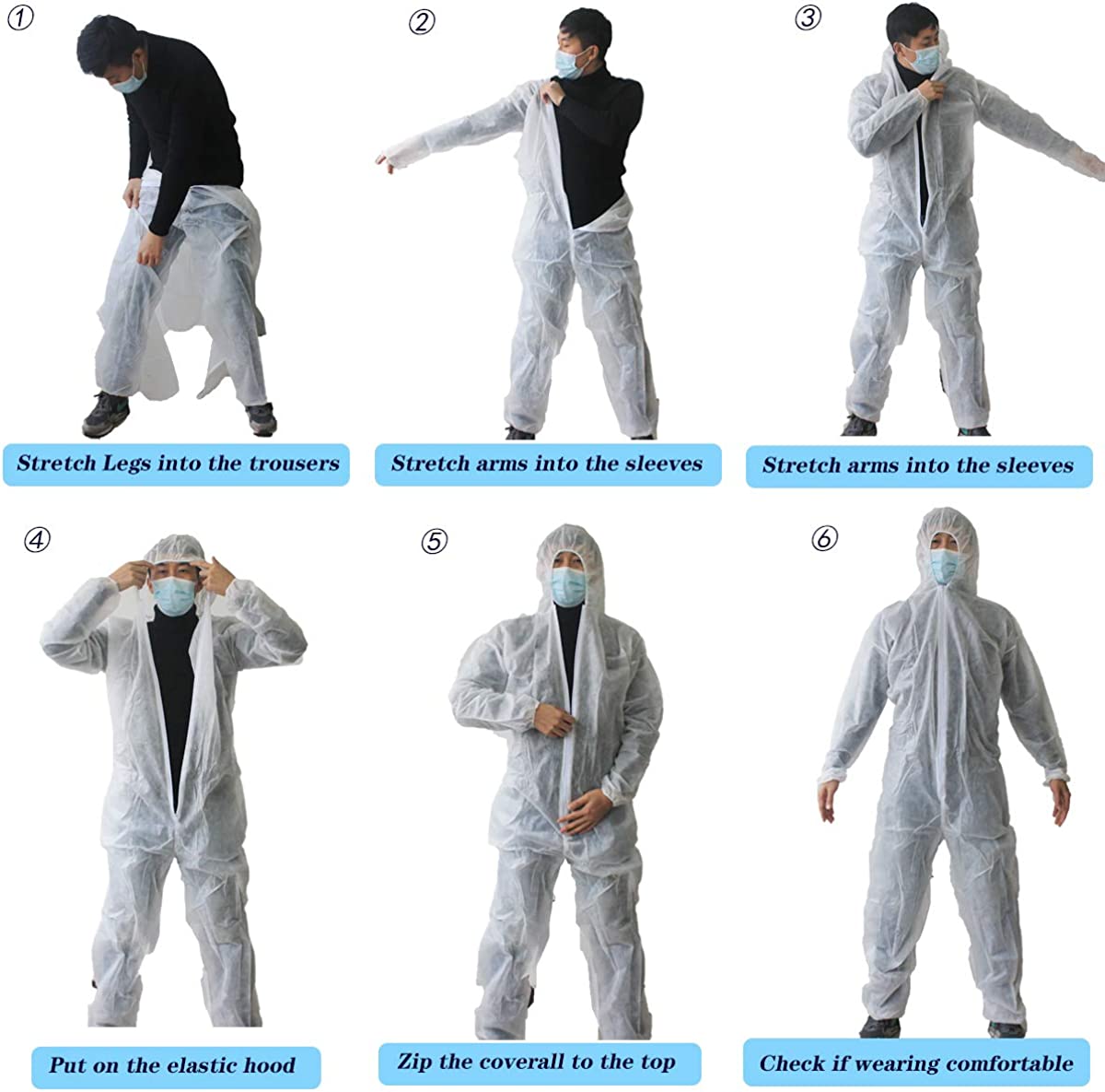 • 【PROTECTIVE OVERALL SUIT】Front zipper closure, easier donning and doffing, Elastic cuffs,waist,ankles add the secure seal protection you need ensure a snug fit. Attached hood with elastic around face opening, designed to cover neck and chin and fit around face mask, keep tight seal from pesticides or paint
