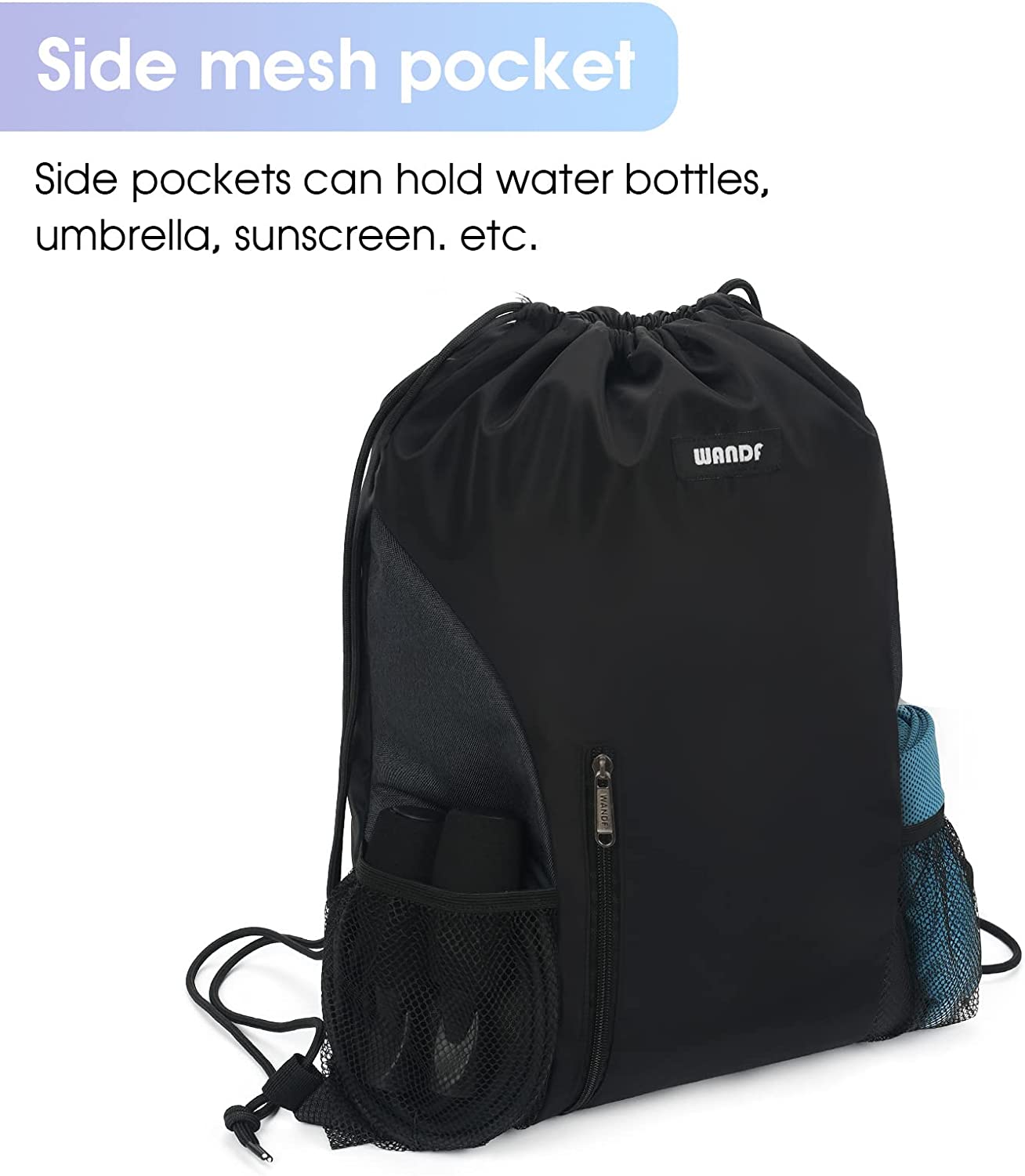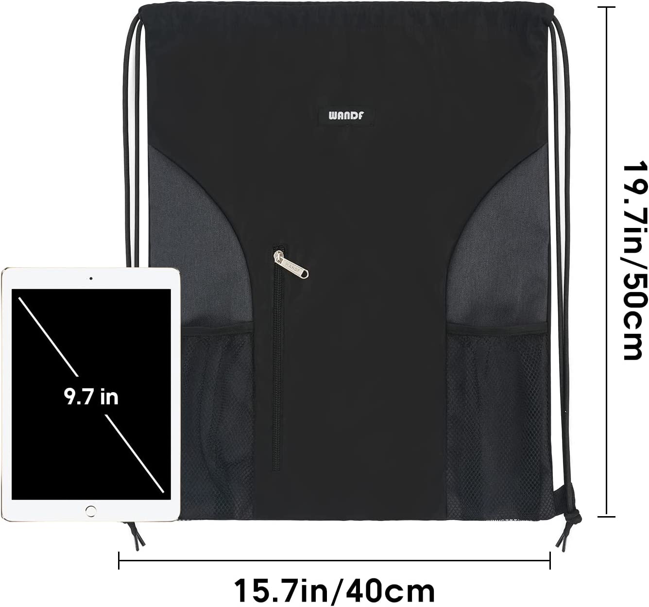 • LARGE CAPACITY--- WANDF drawstring backpack for men&women with large compartment measures 13.3" x 15.3", which is big enough for basketball, gym clothing, sport towel, ipad, textbooks and daily supplies. Two mesh side pockets can be used to hold your water bottle and umbrella.