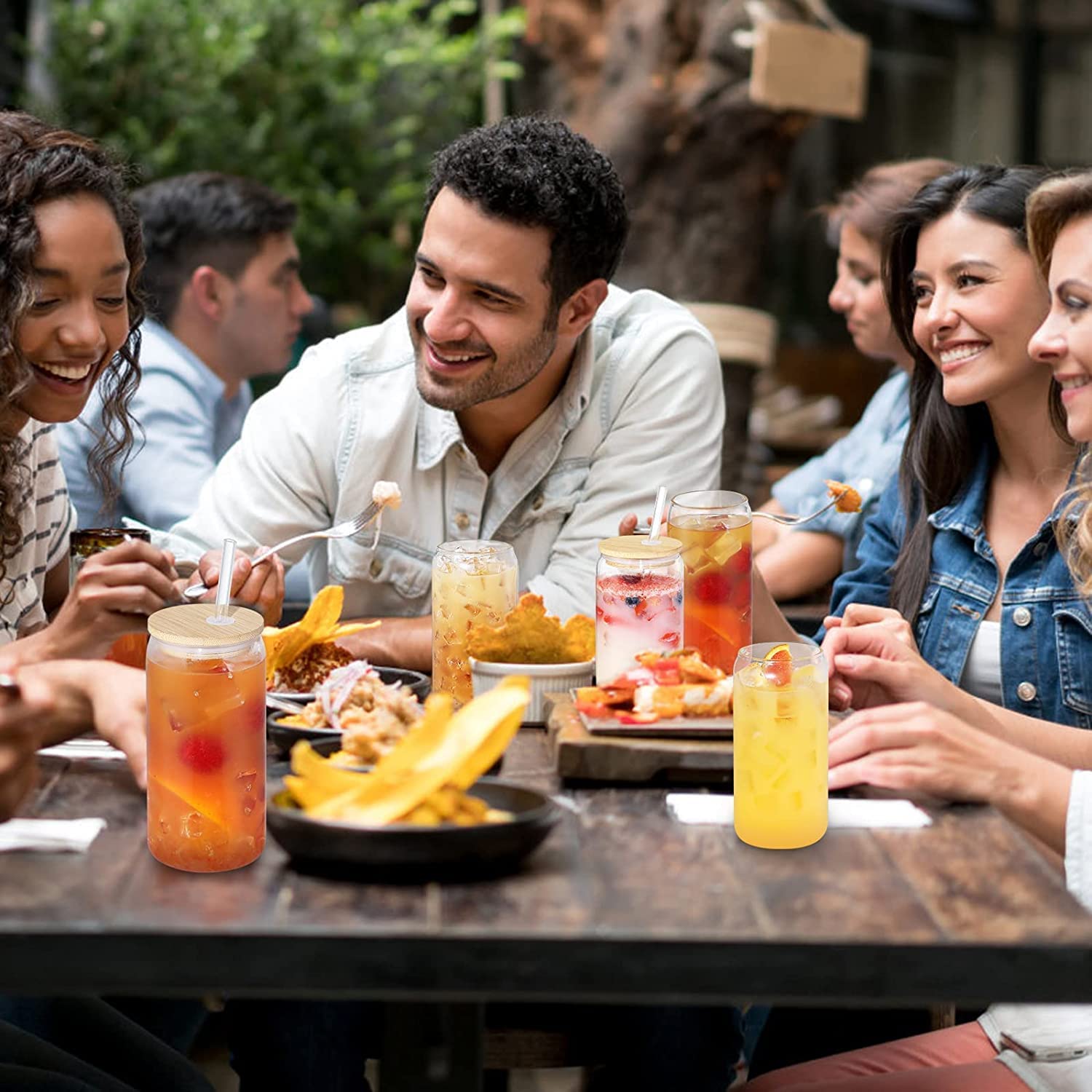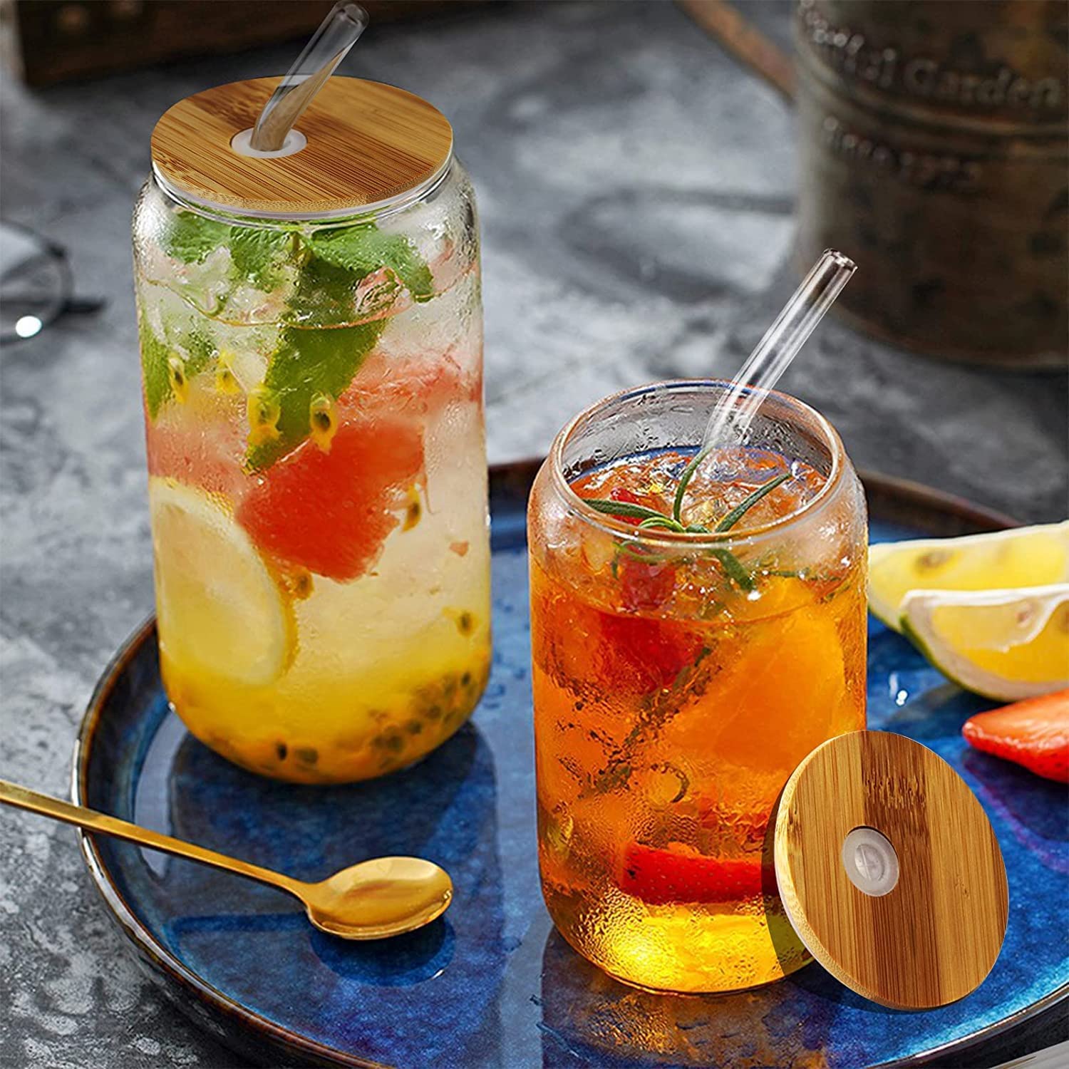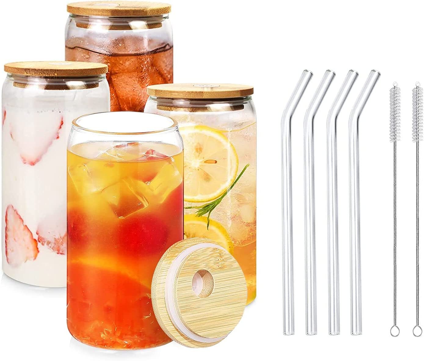 Glass Cups with Bamboo Lids and Glass Straw 4pcs Set - 16oz Can Shaped Drinking Glasses, Beer Glasses, Iced Coffee Glasses, Iced Tea GlassesCocktail, Whiskey, Wine, Soda, Gift - 2 Cleaning Brushes