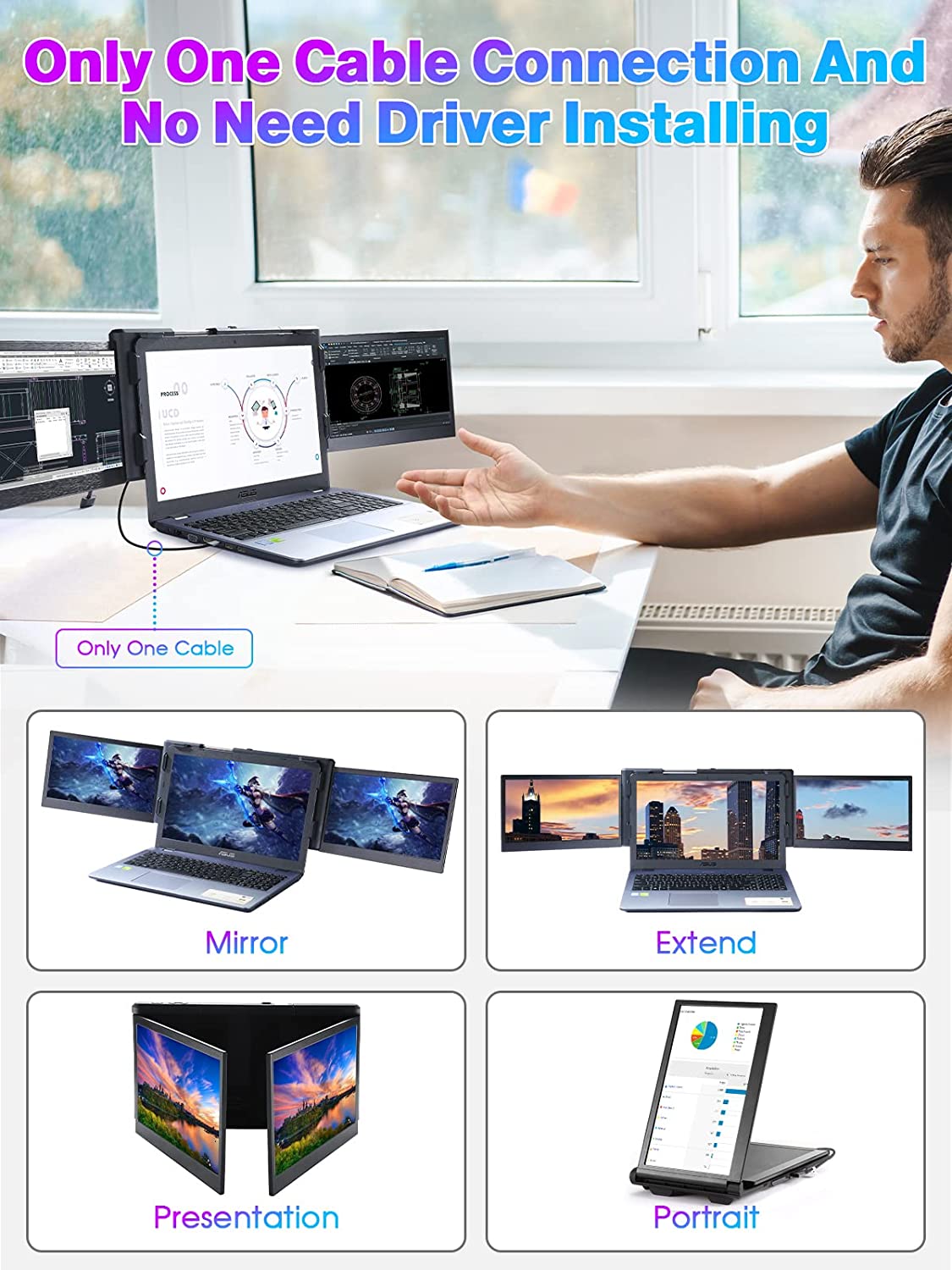 【Only One Cable Needed】Suitable for 13.3"-16.5" Laptops, Compatible with Windows system laptop by only one type-C cable if the type-C port of your laptop can supply over 5V2A power, and no need driver installation,then you can light up the whole two screens of the laptop 3 screen extender.(Note:Pls make sure that your laptop has full function type C port which support power,data transmission and display,such as thunderbolt3 and thunderbolt4)