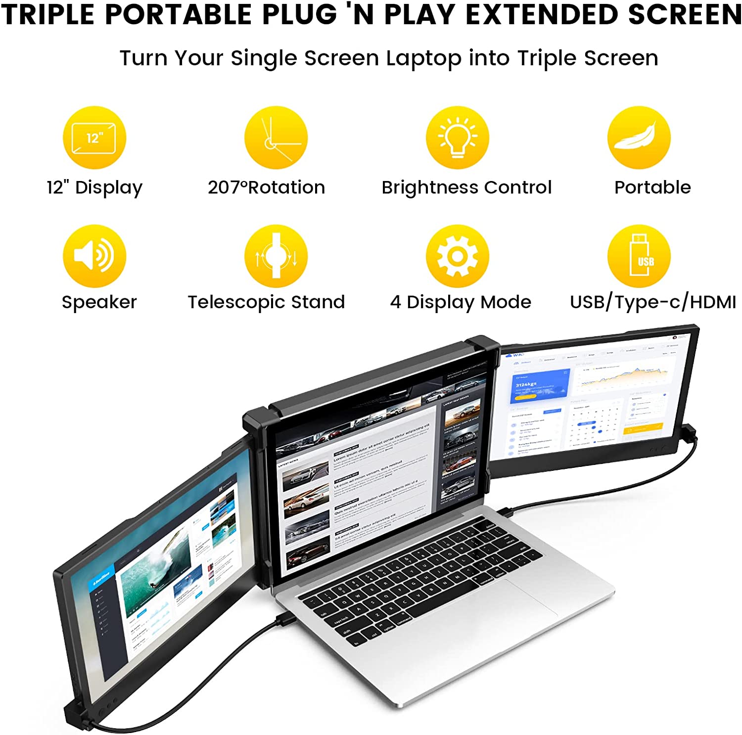 【Easy-to-use design】 The triple portable monitor for laptop can be easily clipped to the laptop frame by just press the button to adjust the size, No need any attachment such as magnets and snaps. Design with a stable and retractable bracket,can be effectively hold the extender to a suitable angle,at the same time prevent the weight of the extender hurt your laptop own screen.