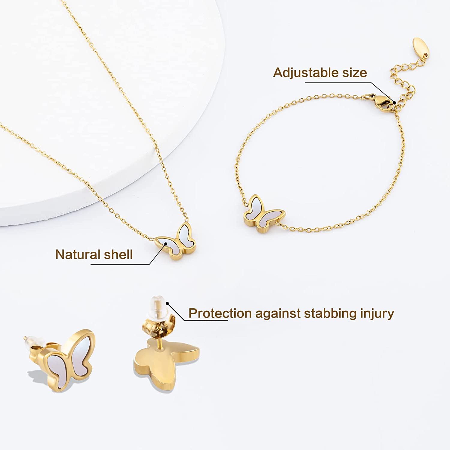 ✦ Butterfly Jewelry Set: You will have 3 different butterfly jewelry . it's including 1 pair earrings, 1 pcs necklace, 1 bracelet per one set. You can match different way according to your different clothes.Butterfly set designed of its inspiration of love and freedom,it is simple and beautiful, highlighting your nobility.