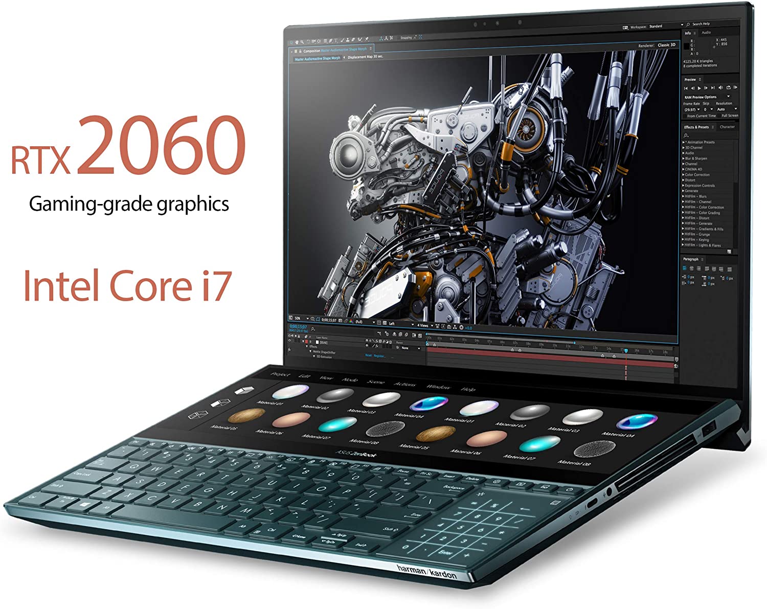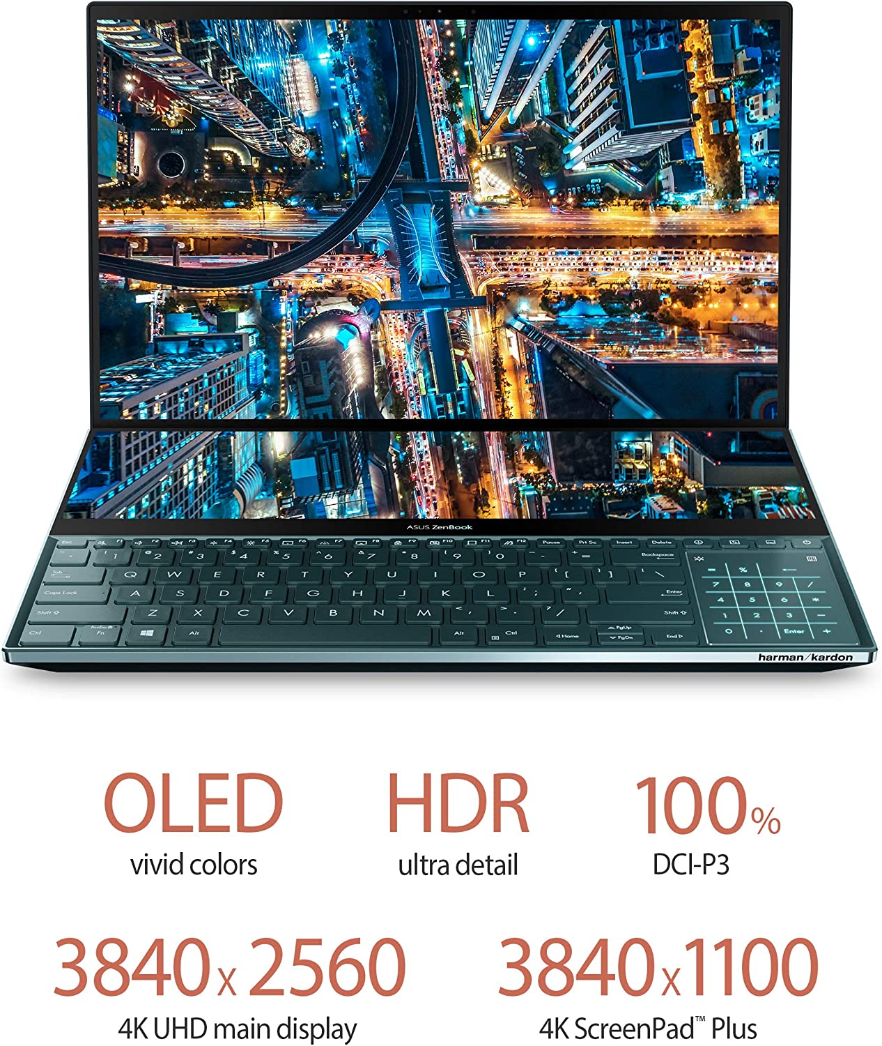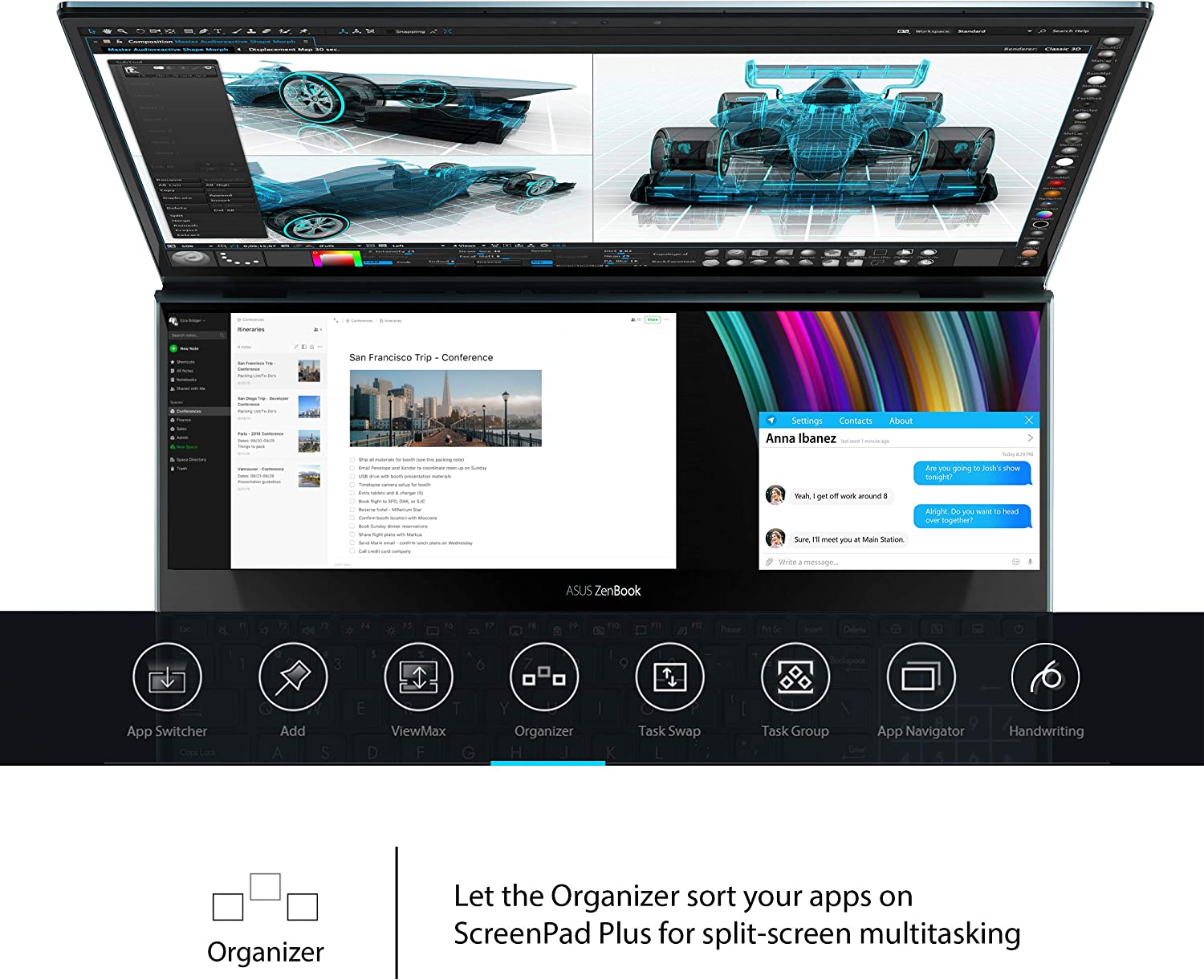 ASUS ZenBook Pro Duo UX581 with ScreenPad™ Plus gives you on-the-go computing like you’ve never experienced before. The 4K secondary touchscreen that works seamlessly with the main 15.6 inch 4K UHD OLED touchscreen, giving you endless ways to optimize and personalize your workflow. A series of handy built-in apps help boost your productivity. Quick Key allows one-tap automation of complex keyboard sequences and Handwriting lets you input text intuitively. Task Group lets you lock into work mode by opening multiple tasks with a single touch and now you can drag apps or in-app toolbars onto ScreenPad™ Plus to give you more room to work on the main display, wherever you are. There are also useful quick control functions such as App Switcher, ViewMax and Task Swap for intuitive interactions between the main display and ScreenPad™ Plus. With ZenBook Pro Duo and the bundled stylus, you can really let your creativity flow. Both multi-touch displays support stylus input and ScreenPad™ Plus gives you a superbly ergonomic and stable platform for writing or drawing. Take notes, sketch out your ideas, or do precision graphical editing in the most intuitive way ever. There’s also a separate palm rest in the box, which enhances the ErgoLift tilting keyboard design to give you the most comfortable typing experience ever. ZenBook Pro Duo is powered by up to a 10th Generation Intel® Core i9 eight-core processor, the latest gaming-grade NVIDIA GeForce RTX 2060 graphics, and blisteringly fast storage. This ultra powerful combination ensures that ZenBook Pro Duo takes professional-quality tasks in stride, such as multi-layer photo or video editing, 3D graphics rendering, or even game live-streaming. *The actual transfer speed of USB 3.0, 3.1, 3.2 (Gen 1 and 2), and/or Type-C will vary depending on many factors including the processing speed of the host device, file attributes and other factors related to system configuration and your operating environment. Duo can effortlessly handle all the apps on your main screen and screenpad Plus, for the most fluid cross-screen workflow ever.