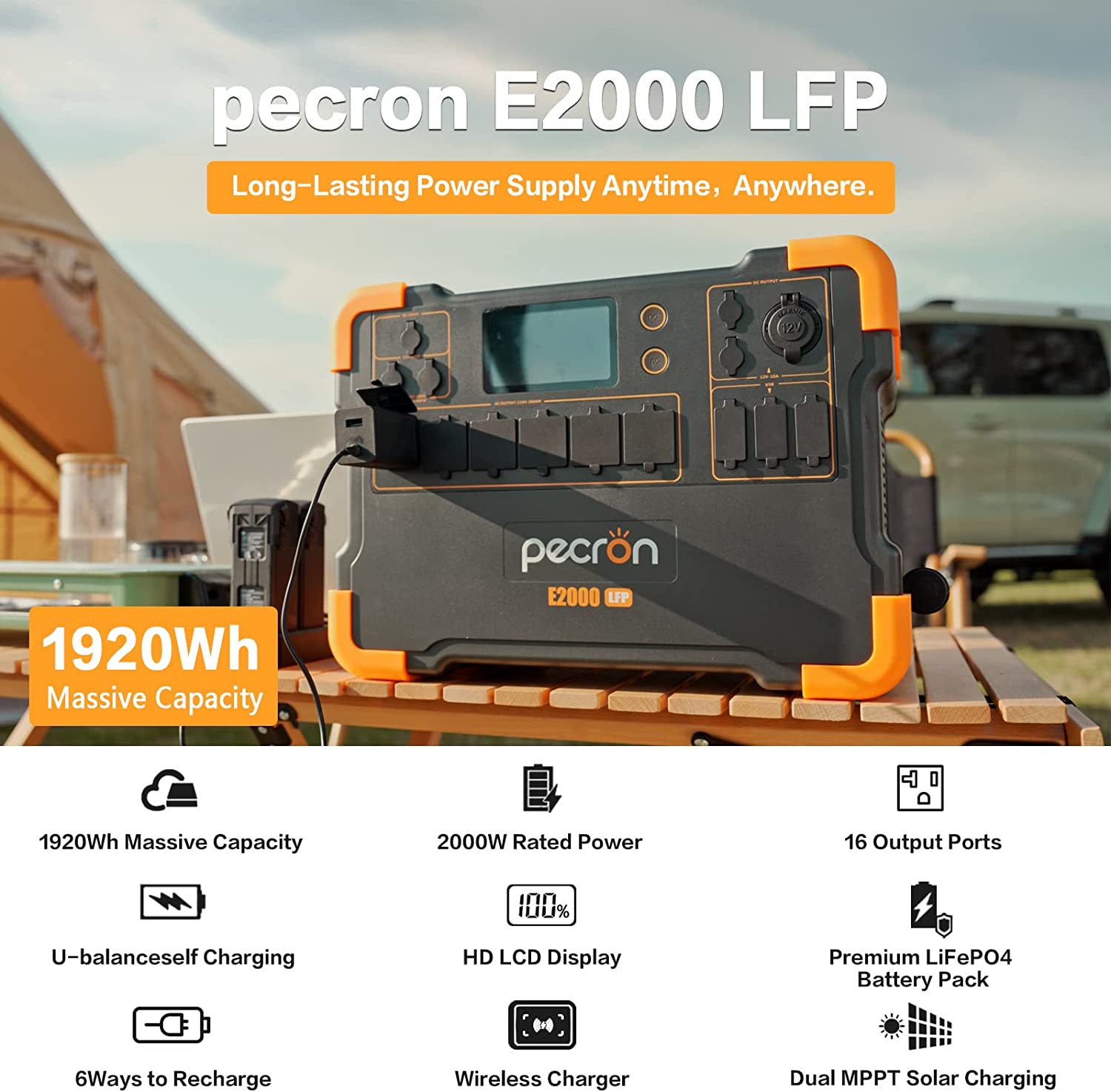 Power it ALL:E2000LFP has 16 output ports that can run up to 16 devices at a time. Including 6x 2000W AC outlets, 6x USB ports up to PD 100W, 1x Cigar port, 2x DC ports, and 1x 15W wireless charger,compatible with virtually all essential devices