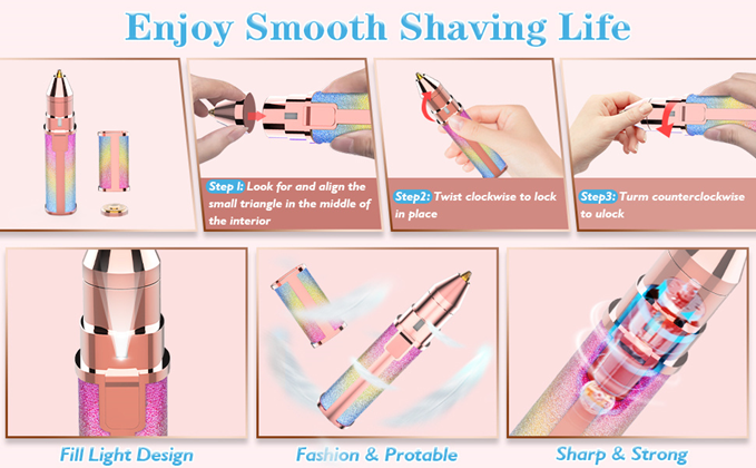 Specially designed to use on the upper and lower lip,cheeks, chin, Eyebrows, and neck. Works on peach fuzz or fine hair. Go slow with circular movements and the eyebrow razor will remove unwanted hair gently.