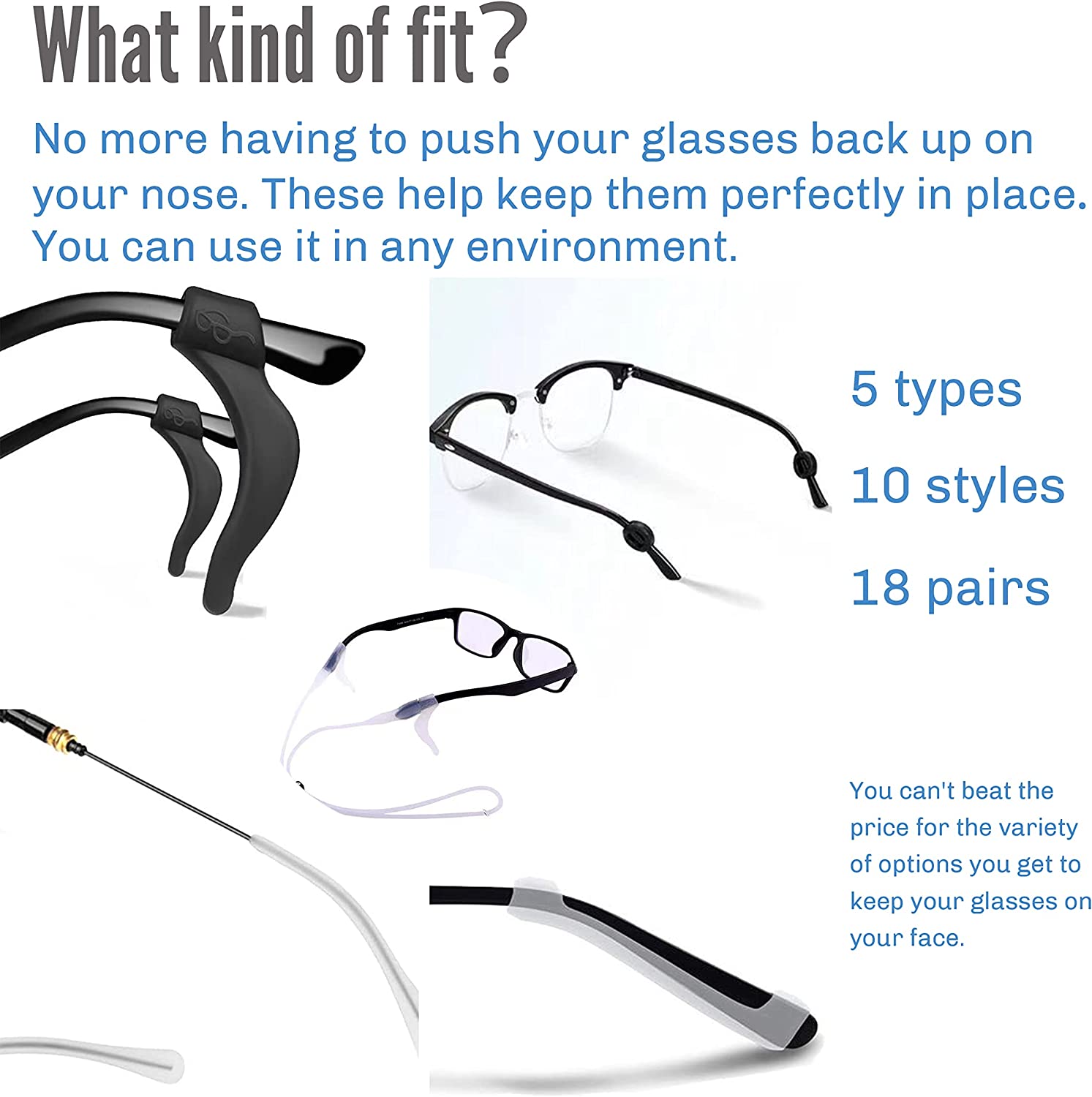 Safety Eyewear Retainers:we have 6 types 10 styles 18 pairs 34pcs (black and white),2 pairs x Sports Glasses straps,4 pairs x Eyeglass Ear Grip Hook,4 pairs x Eyeglass Ear Grip Hook (round),4 pairs x Eyeglasses Temple Tips Sleeve Retainer,4 pairs x Anti-Slip Silicone Eyeglass End Tips