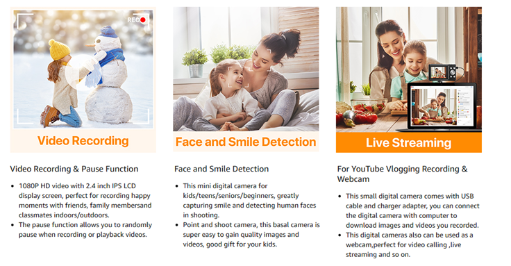 - 【PAUSE FUNCTION & EASY TO USE】: The pause function allows you to pause when recording or seeing playback videos. And the built-in fill light helps you to take quality pictures in the dark.This digital camera for teens is easy to operate and control, this kids camera is the best choice for the Christmas gift or birthday gift for kids and the elder people.