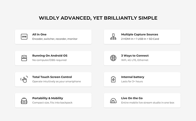 • All-In-One Versatility: YoloLiv Instream is a full HD live broadcast device integrating encoder, switcher, monitor and recorder, with built-in battery and native support for 4G LTE, WiFi, Ethernet. Perfect for traditional videography customer groups, like worship, weddings/funerals, sport, events, education, and NEW verticals like creators, influencers, storytellers, live-sellers and much more.