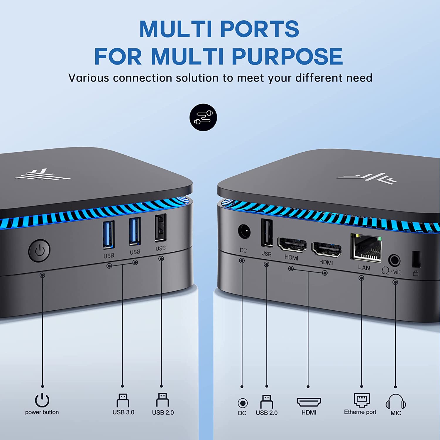 【STRENGTHEN YOUR WORK-SPACE】 Designed with 1 x DC, 2 x USB 3.0, 2 x USB 2.0, 1 x RJ45 Gigabit Ethernet port, 2 x HDMI ports, 1 x audio input/output, which can be connected to your multimedia devices, mouse, acoustics or headset. Mini-PC supports multiple device connections and can be used with servers, monitoring equipment, office equipment, displays, projectors, televisions, etc. Whether a compact size or lightweight becomes your optimum portable mini tower pc for the business trip.