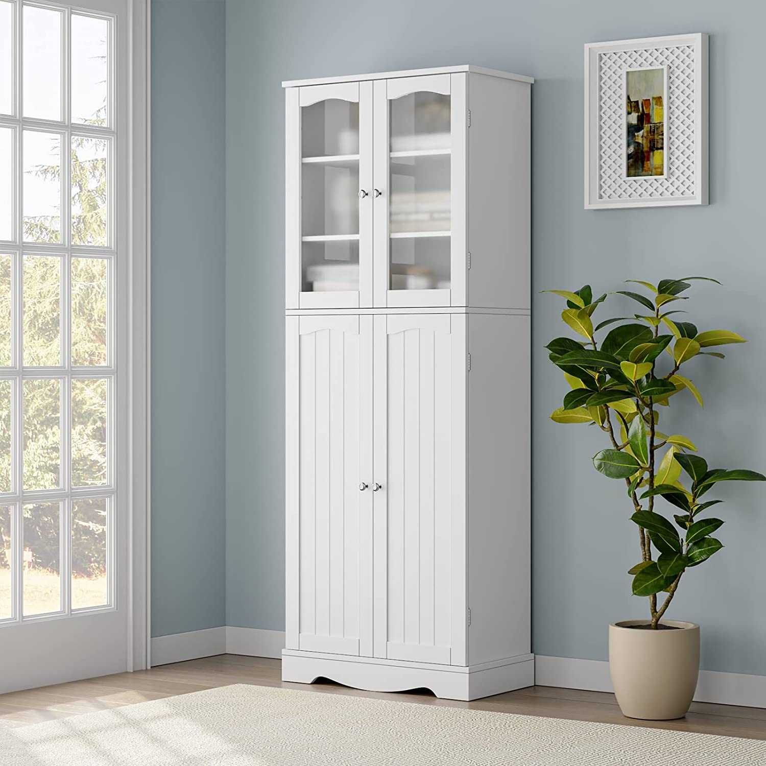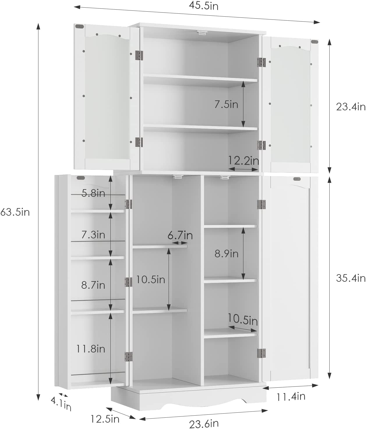 【Long-lasting Materials】Constructed from high-quality MDF, the tall pantry with a reinforced wall attachment for stability. With premium white paint craftsmanship, the surface is smooth, waterproof and scratch resistant. Product dimensions: 23.6"L x 12.5" D x 63.5" H